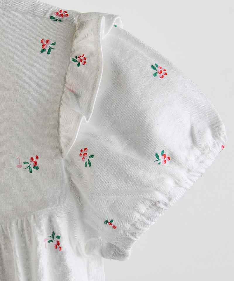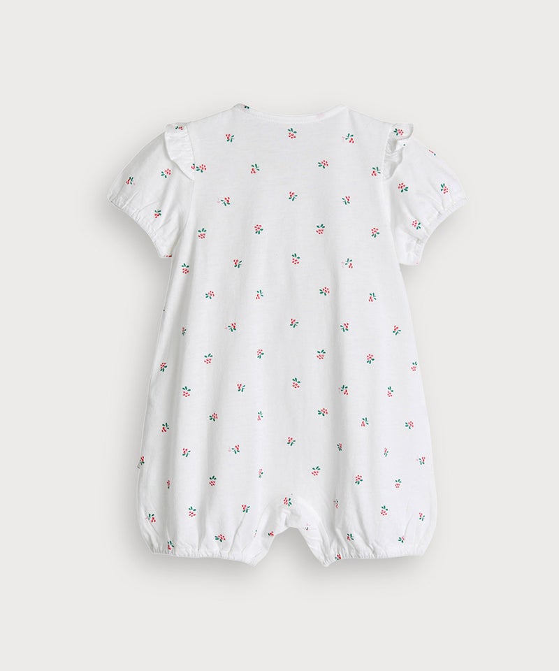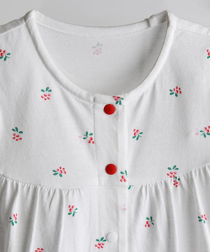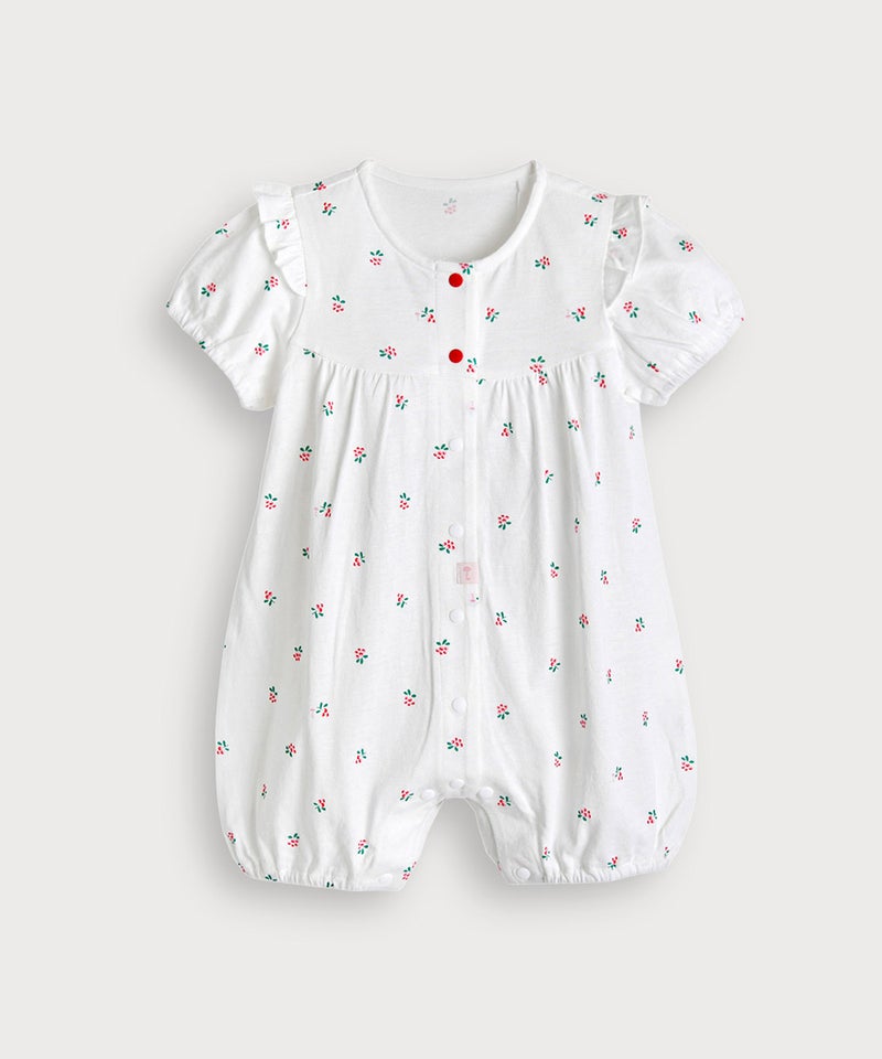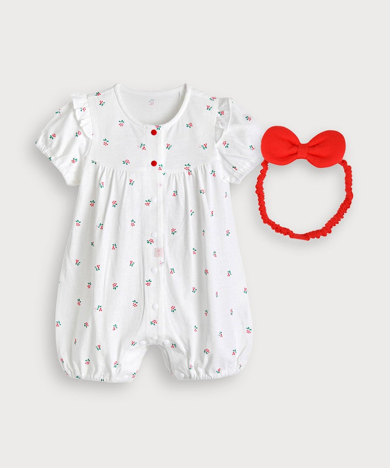 赤いベリーがちりばめられたCuteなプリントの半袖ロンパースとリボンヘアバンドのセット。