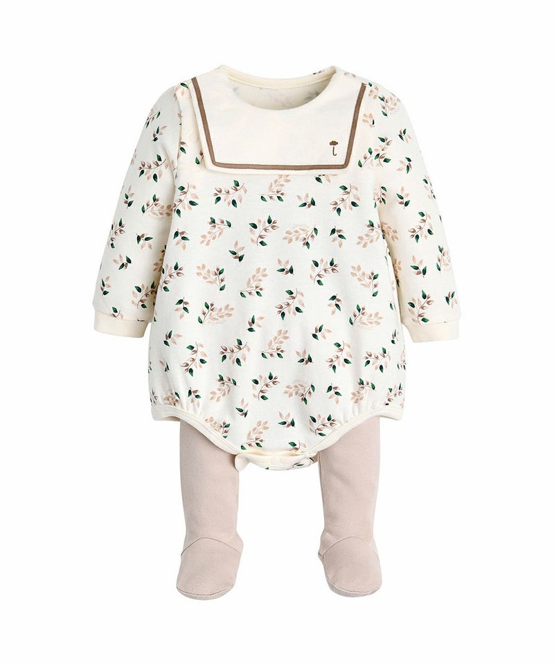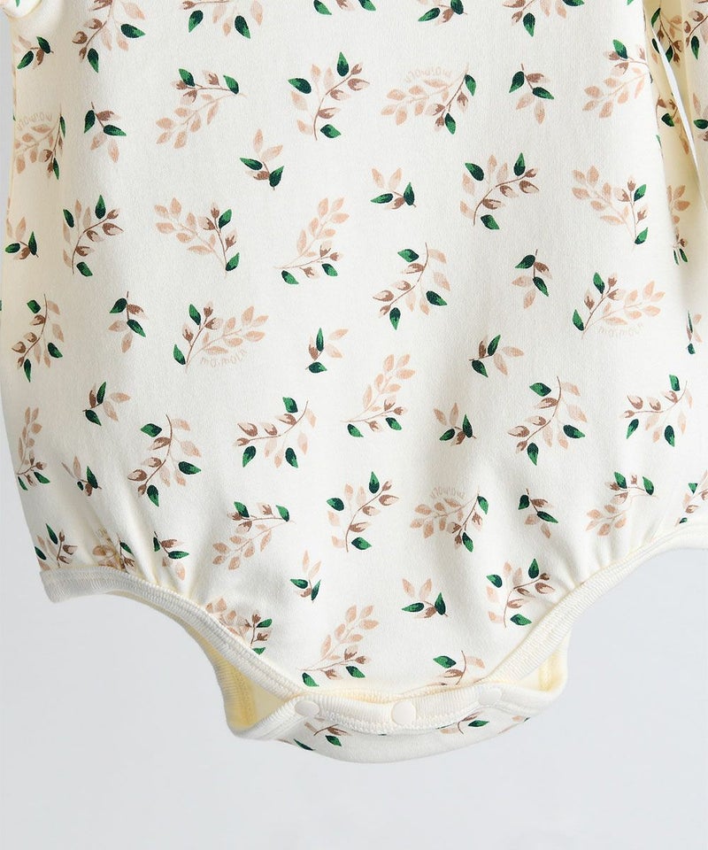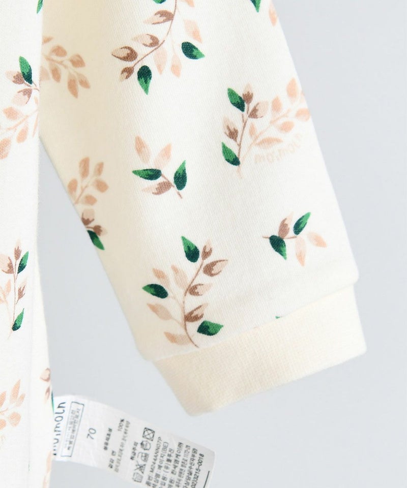 伸縮性のある素材を使用したレギンスとロンパースのセット。ユニークなリーフ柄とスクエアのスタイがおしゃれポイント。ベビーギフトとしても喜ばれるアイテムです。
