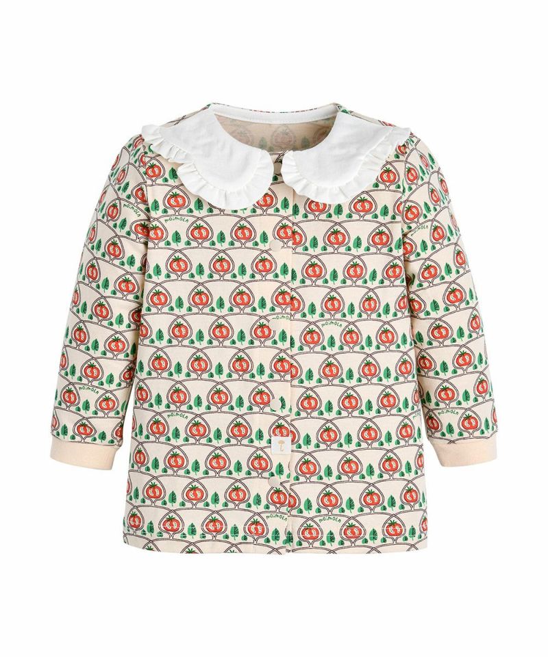トマトモチーフのプリントに襟とコットンのレースでポイントを加えたセットアップです。