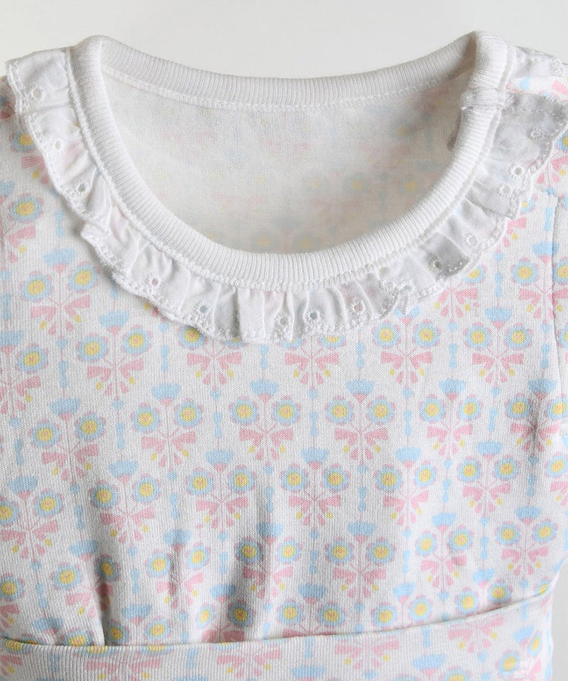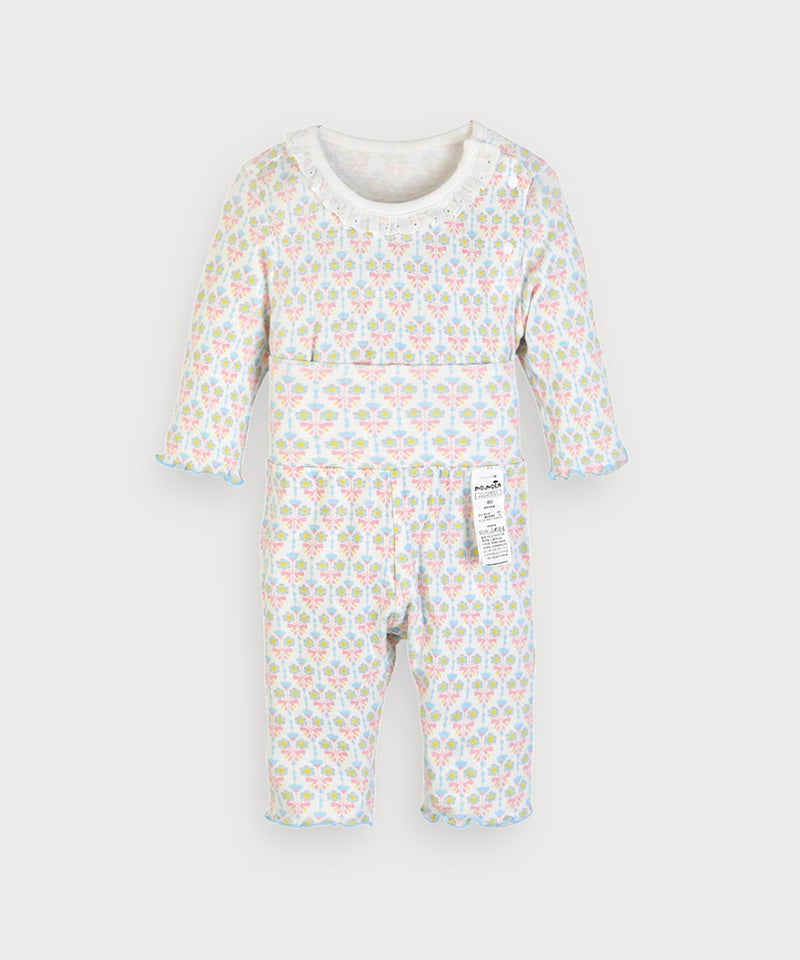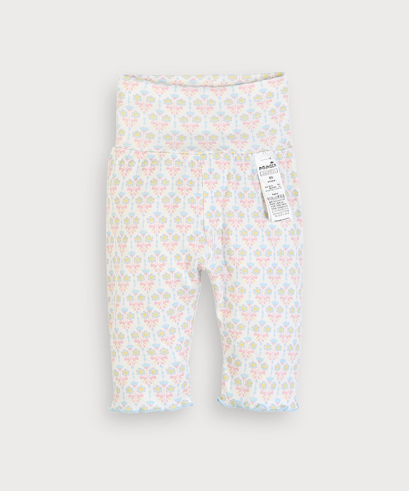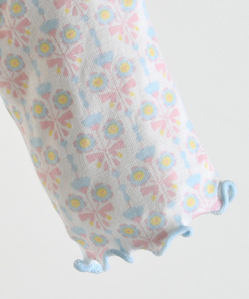 ピンクとブルーのパステルカラーの花プリントがかわいい七分袖トップスと腹巻パンツのセット。