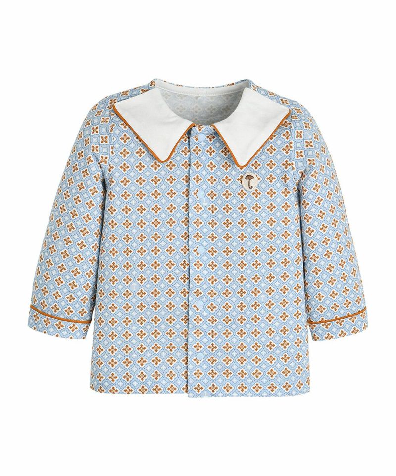 レトロなプリントに襟とパイピングラインをポイントに加えたルームウェアです。