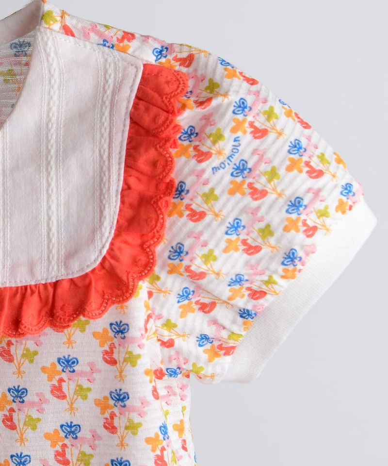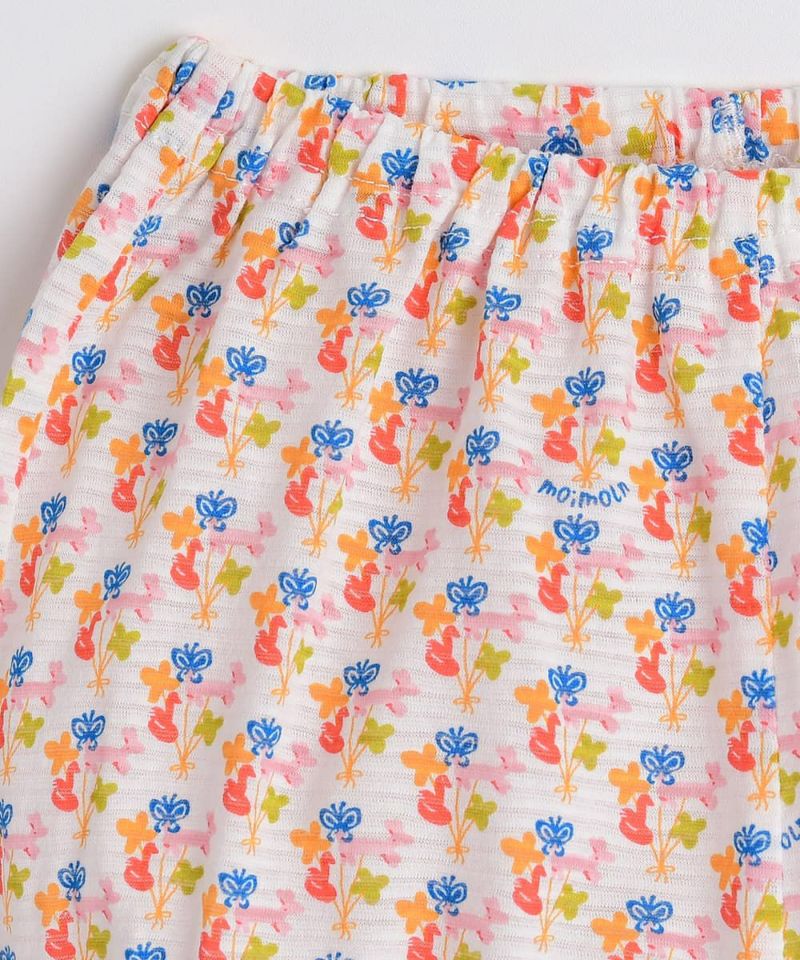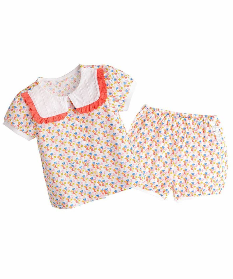 清涼感のある素材を使用したルームウェア。汗を吸収し乾きやすい生地感で、涼しさをキープします。花モチーフのデザインと、襟の配色がポイント♪