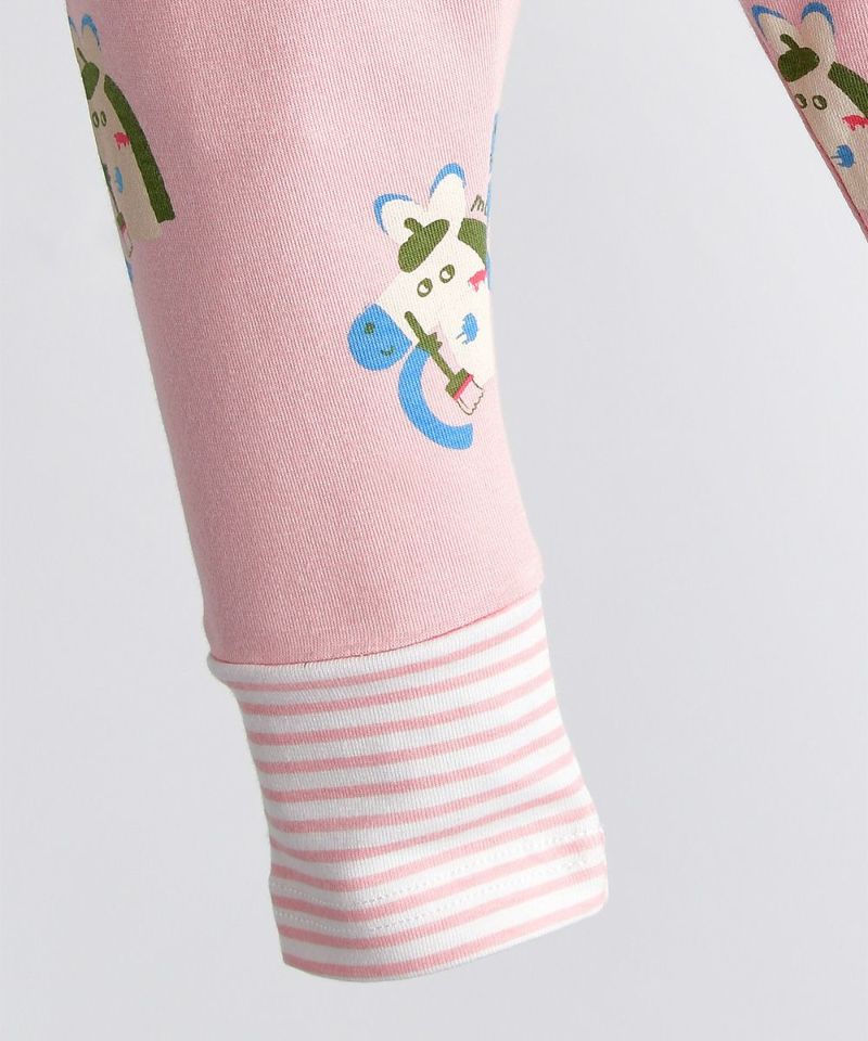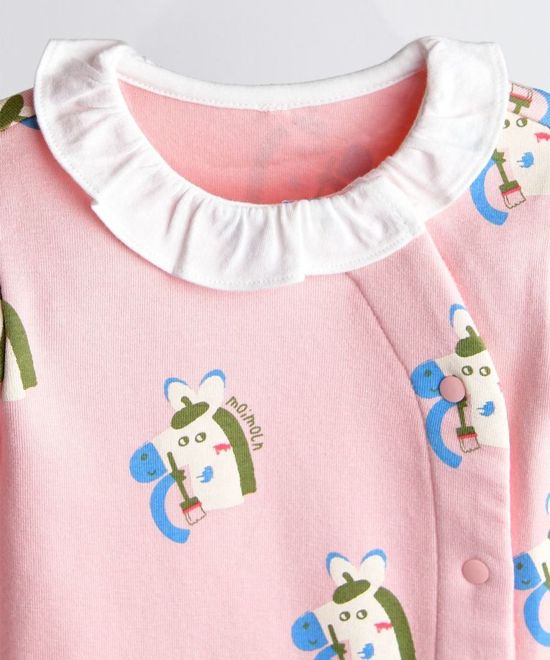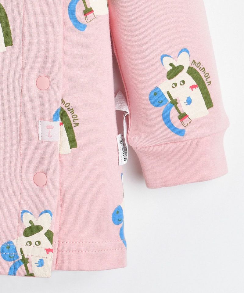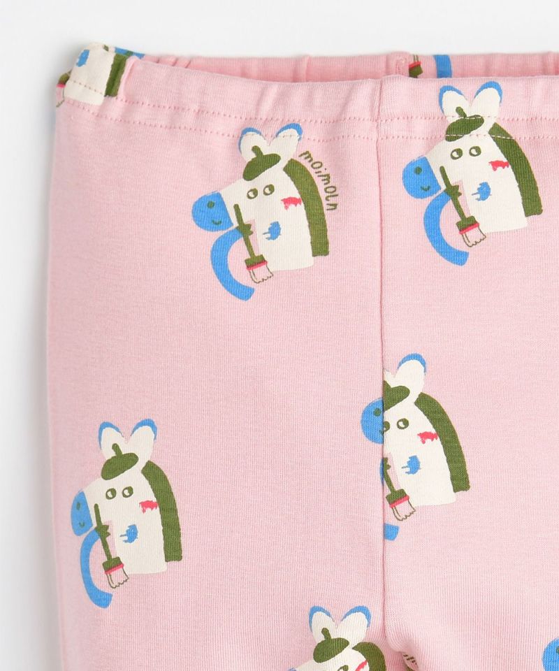 コットンモーダル素材を使い、やわらかいタッチ感が特徴で、ストレッチが入っていて動き安さ◎。かわいいポニーのプリントに白いフリルと足首のボーダーがポイントになります。