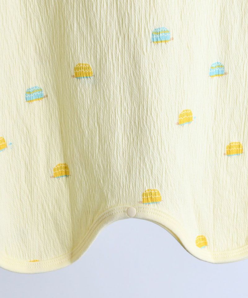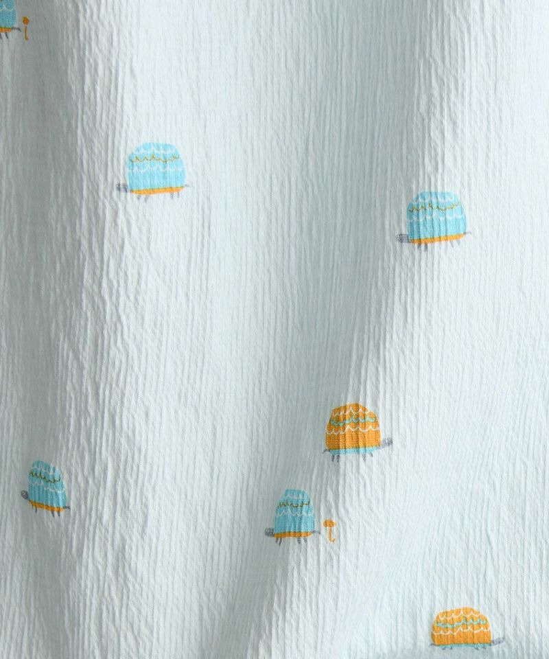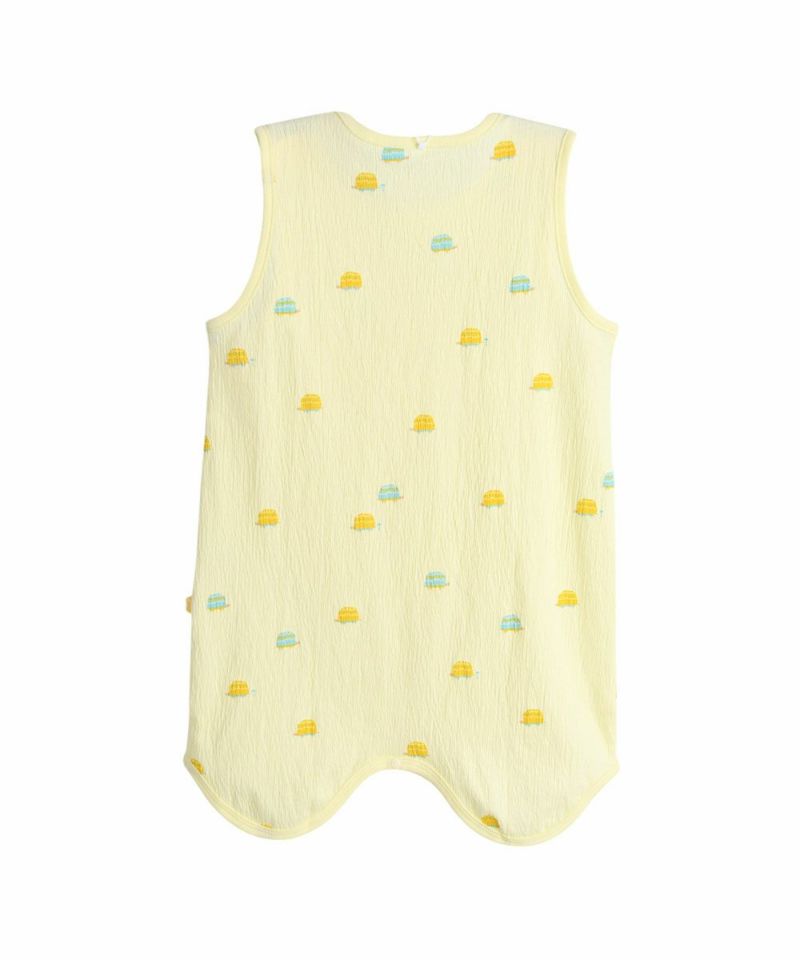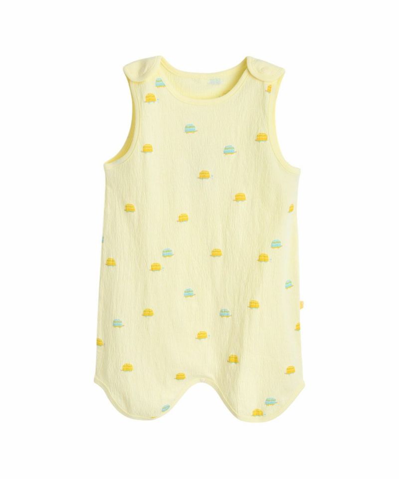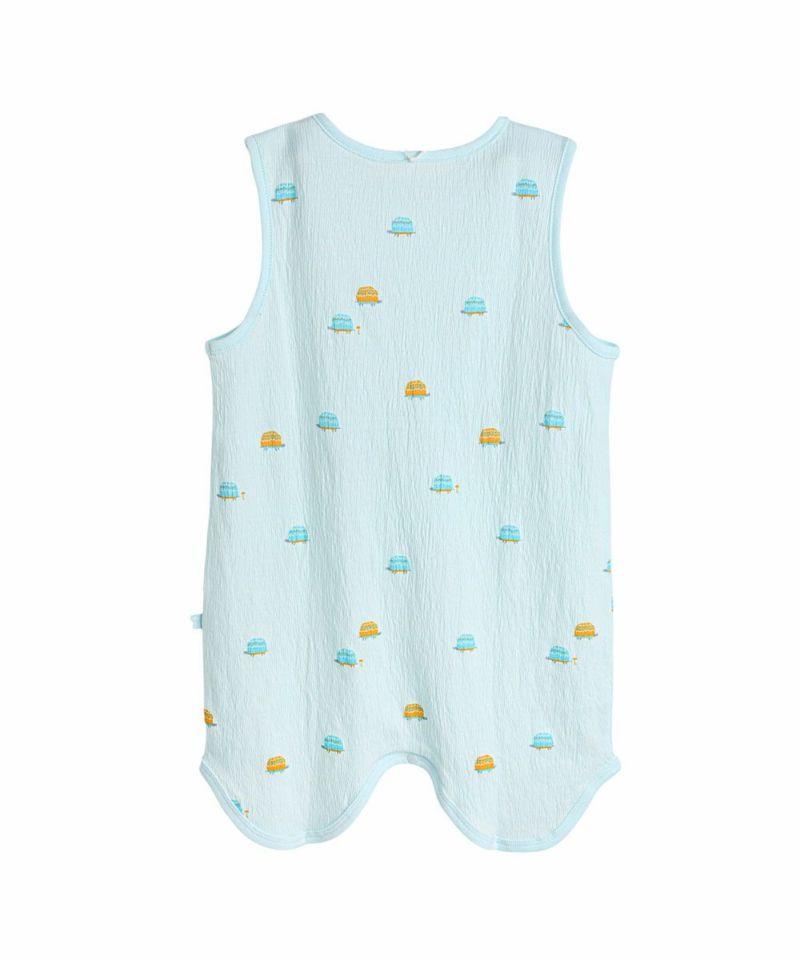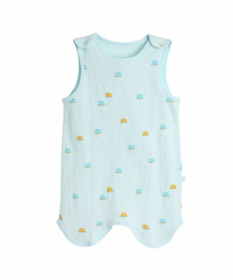 かわいいカメプリントのスリーパー。お子様の就寝時の冷え防止になるスリーパーは着心地の良さも重視しています。伸縮性に優れた生地を使用して、両肩と股部分にスナップボタンで脱着もスムーズに。
