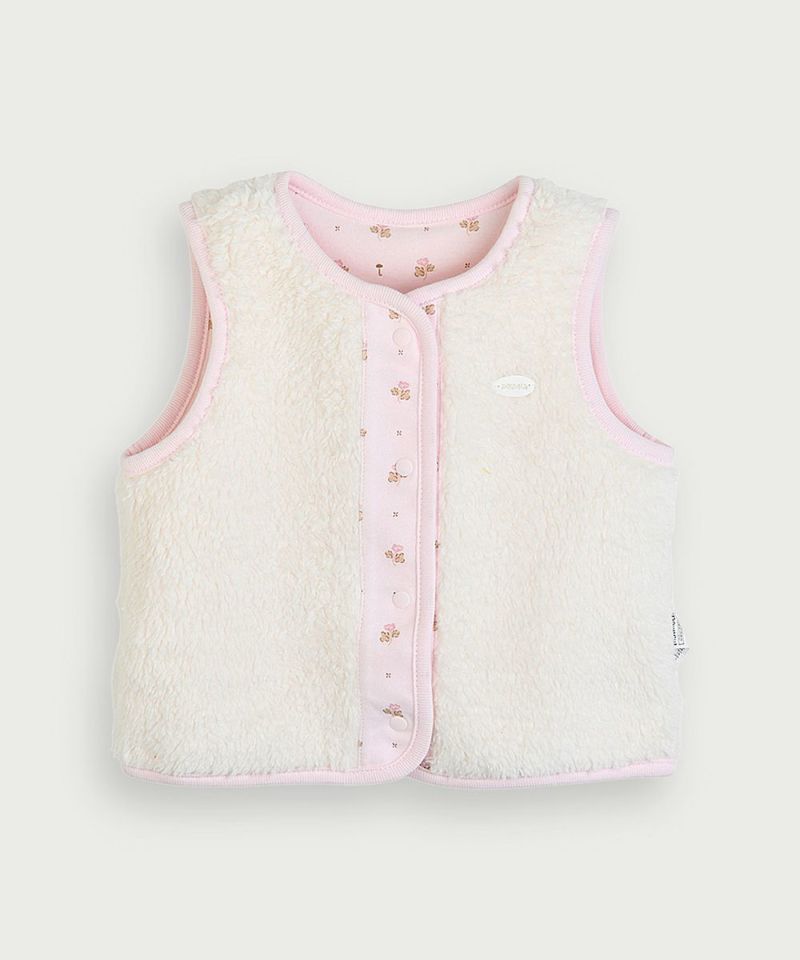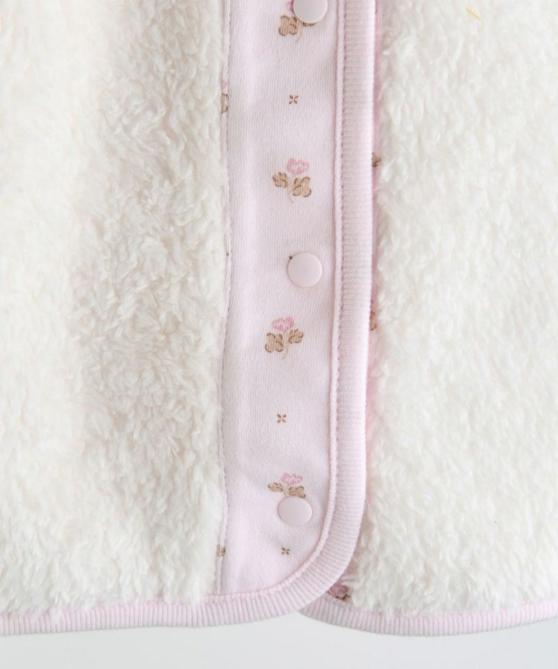 うれしいリバーシブルタイプのルームベスト。色によってネコのミャオ(meow)やCuteなフラワーの総柄タイプと、モコモコで柔らかく肌ざわりのよいフェイクファーにパイピングにコットン側の生地が配色されタイプがあり、胸元にはブランドごろのプレートがさりげなく付いたタイプ。コットン素材の商品は、着心地・肌へのやさしさ・快適性に優れた、毎日着たくなる安心素材です。スナップボタンなので全開きとなり脱着も簡単です。