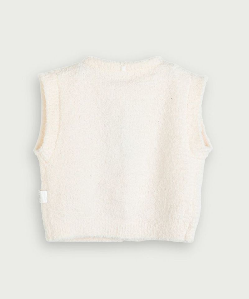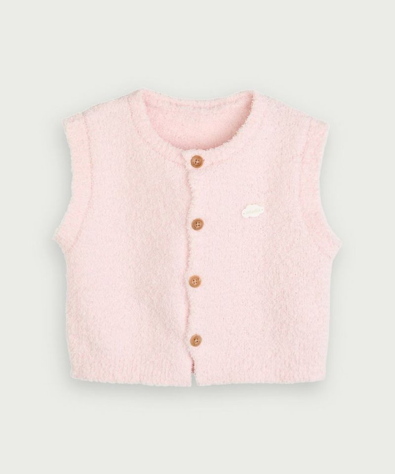 軽量で柔らかく、伸縮性に優れたタクテルニット素材のショート丈のルームベスト。モコモコした生地のパステルトーンカラーにウッド調のボタンがアクセントに。胸元にはブランドロゴのワッペンをさりげなくプラス、フロントはスナップボタンで全開きになるのでお子ささまの着替えも簡単にできます。同素材でカバーオール(M254UUN18P)、スリーパー(M254JSN05P)もございます。