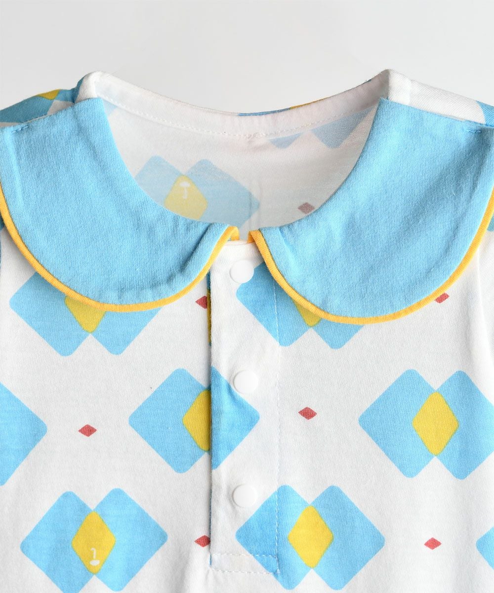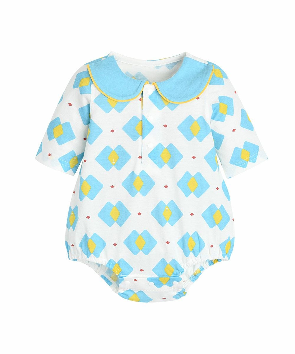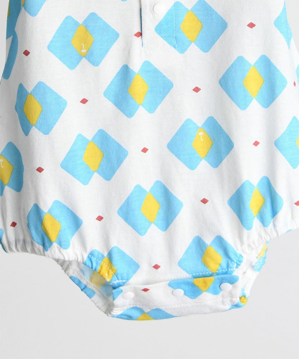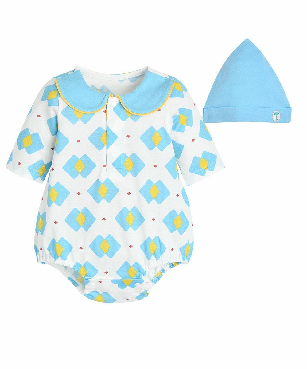 【モダールコットン】ブルーダイヤ柄ロンパース&帽子