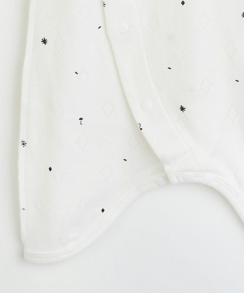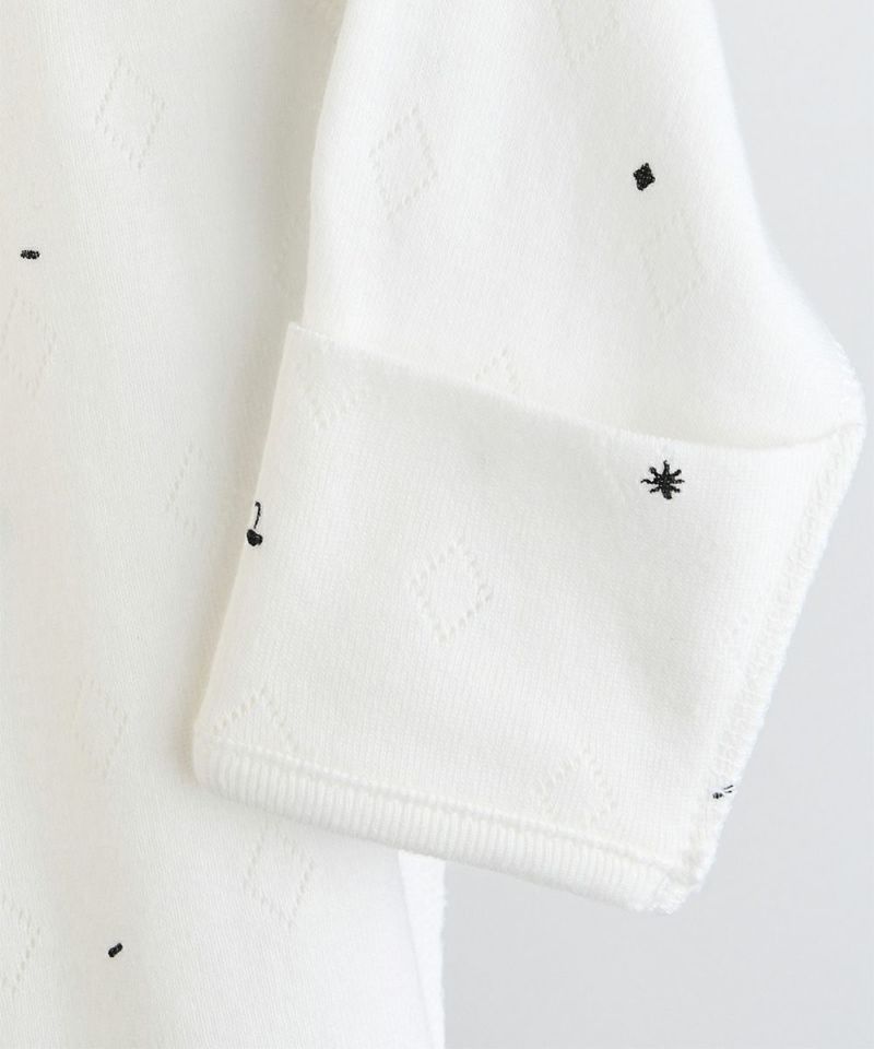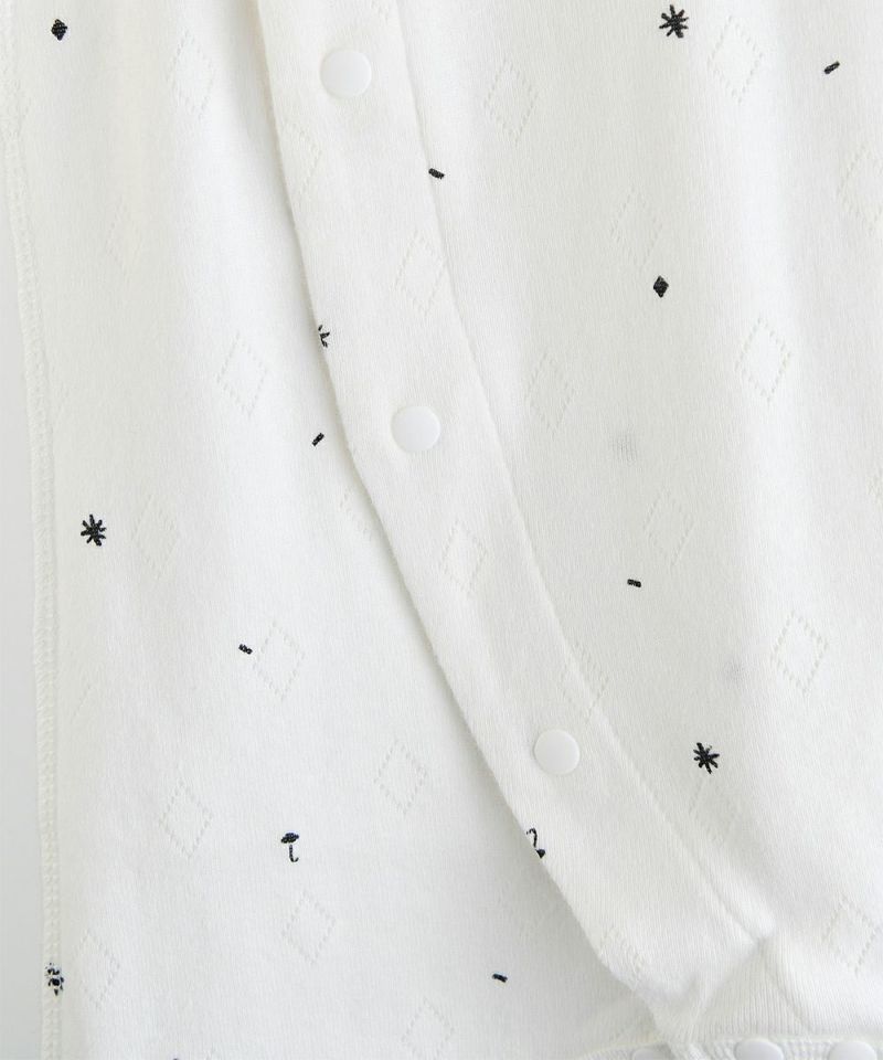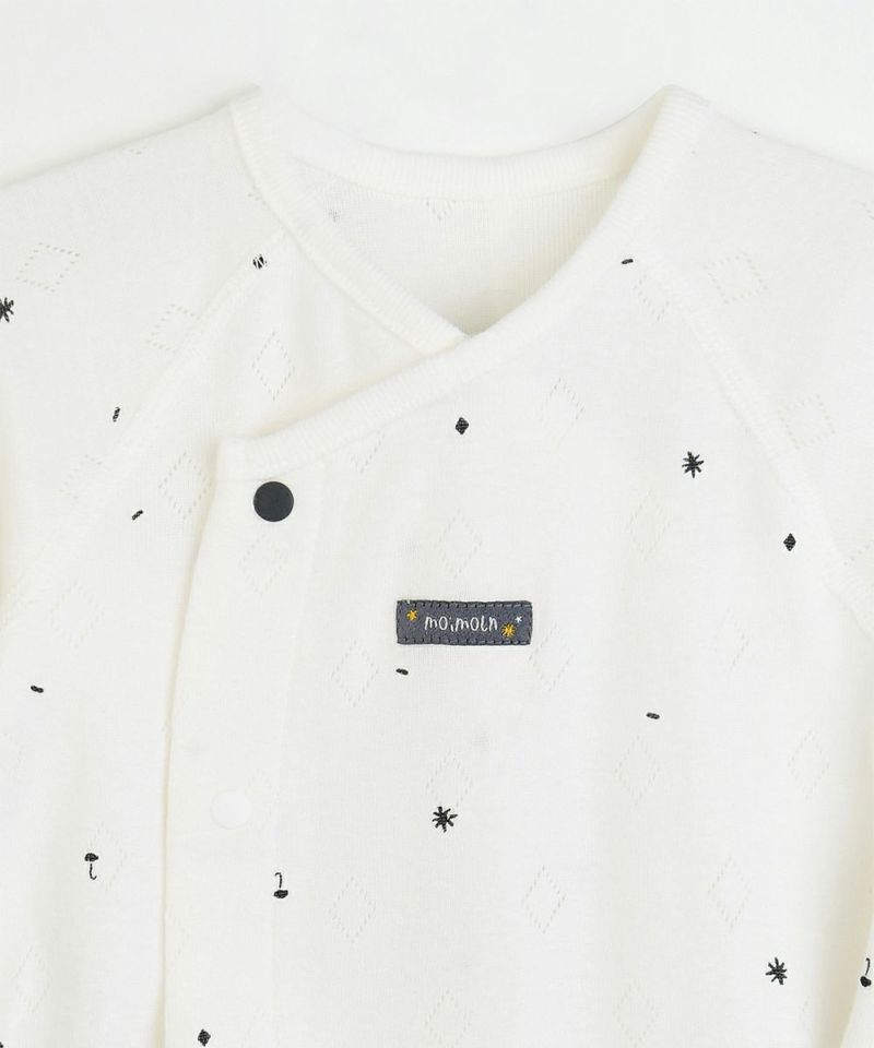 ダイヤアイレット生地の上に小さな柄をちりばめ、フロントにはmoimolnのロゴタグを付けたコンビ肌着。外側は簡単なスナップタイプで着替えのしやすい仕様に加え、脇の縫い目は肌に触れない外縫い仕様なので、赤ちゃんの薄い皮膚にもやさしい肌あたりとなっています。袖口は折り返すと引っかき防止のミトン代わりとなる仕様で、出産祝いなどのギフトにもおすすめです。minimoiとは・・・新生児のための新しいmoimolnのオリジナルシリーズ。