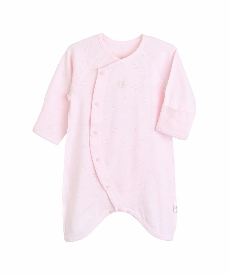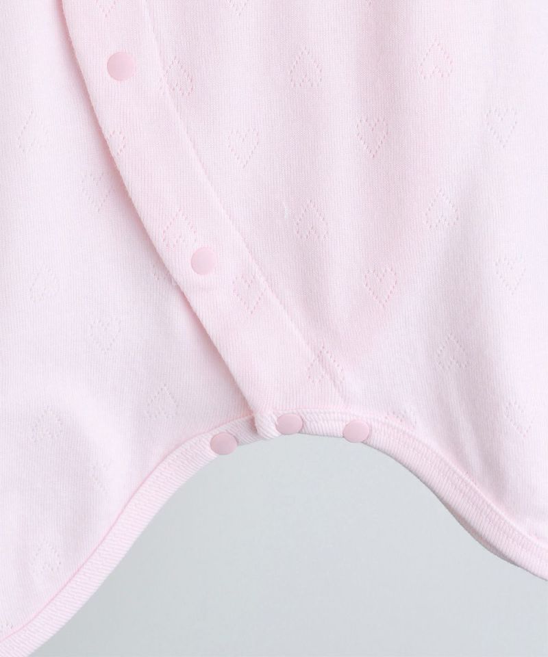 ピンクのハートのアイレット生地に胸元のハートのワンポイントがかわいいコンビ長肌着。外側は簡単なスナップタイプで着替えのしやすい仕様に加え、脇の縫い目は肌に触れない外縫い仕様なので、赤ちゃんの薄い皮膚にもやさしい肌あたりとなっています。袖口は折り返すと引っかき防止のミトン代わりとなる仕様で、出産祝いなどのギフトにもおすすめです。minimoiとは・・・新生児のための新しいmoimolnのオリジナルシリーズ。