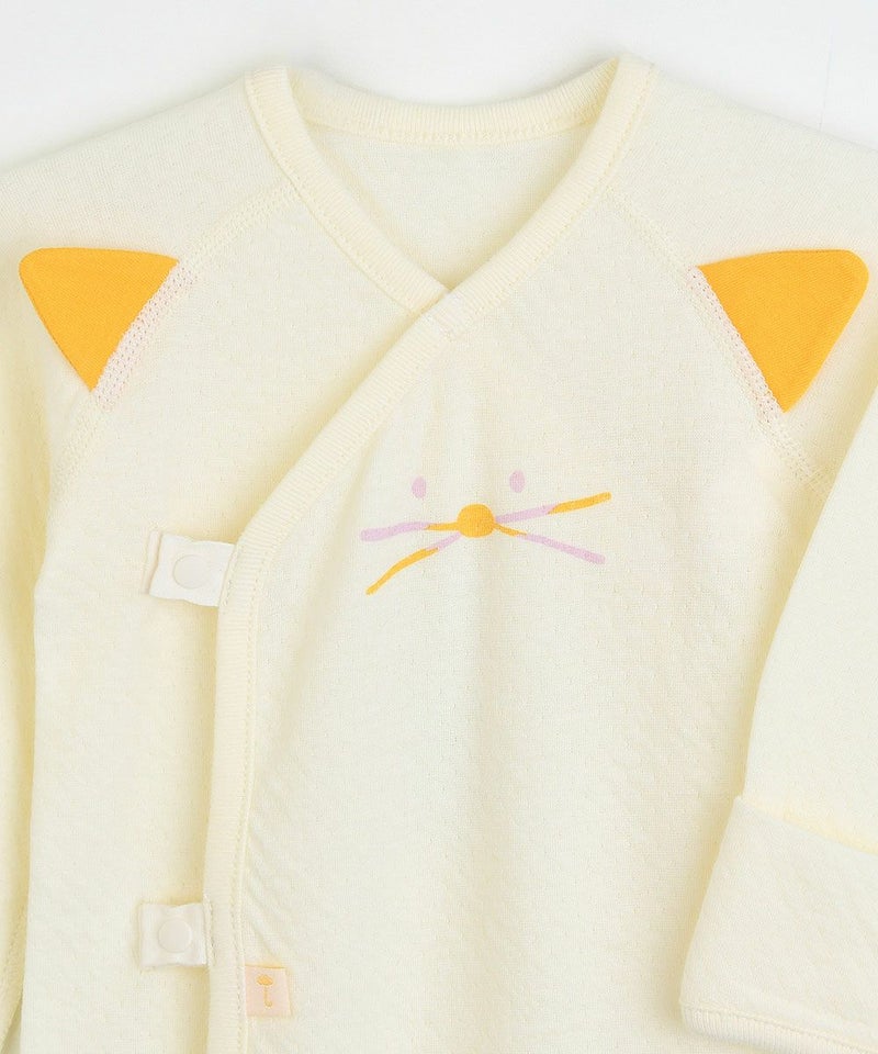 繊細な表面縫製で赤ちゃんの肌をより柔らかく包み込んでくれる新生児用の短肌着。ネコのミャオ(meow)プリントと立体の両耳が愛らしい雰囲気を漂わせてくれます。内側も外側もスナップタイプでお着替え簡単、肌当たりもやさしく、脇などの縫い目は肌に触れない外縫い仕様です。コットン素材の商品は、着心地・肌へのやさしさ・快適性に優れた、毎日着たくなる安心素材です。赤ちゃんのデイリーウェアとしてはもちろん、ギフトにもおすすめの商品です。