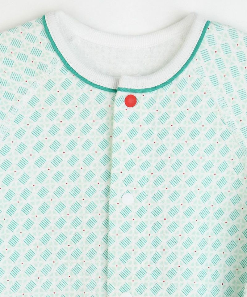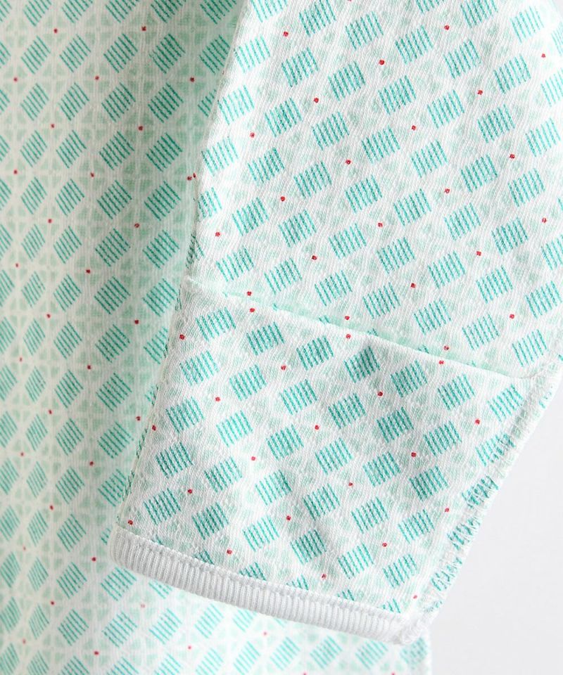 幾何学柄を全体にプリントしたダブルフェイス生地を使用し、繊細な表面縫製で赤ちゃんの肌をより柔らかく包み込んでくれる長袖のコンビ肌着。一つだけアクセントになるレッドのスナップボタンにすることでよりおしゃれ感をアップさせたデザイン。フロントから股部分は、スナップボタンでお着替えが簡単、肌当たりもやさしく、脇などの縫い目は肌に触れない外縫い仕様です。コットン素材の商品は、着心地・肌へのやさしさ・快適性に優れた、毎日着たくなる安心素材です。赤ちゃんのデイリーウェアとしてはもちろん、ギフトにもおすすめの商品です。