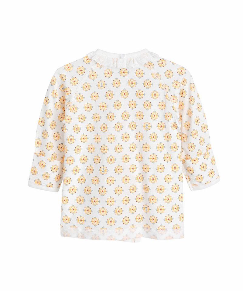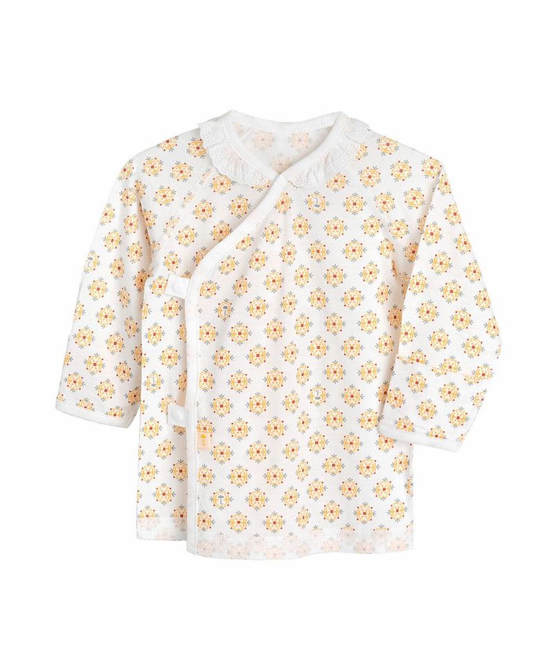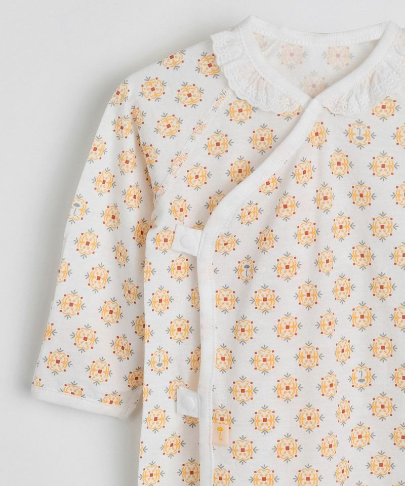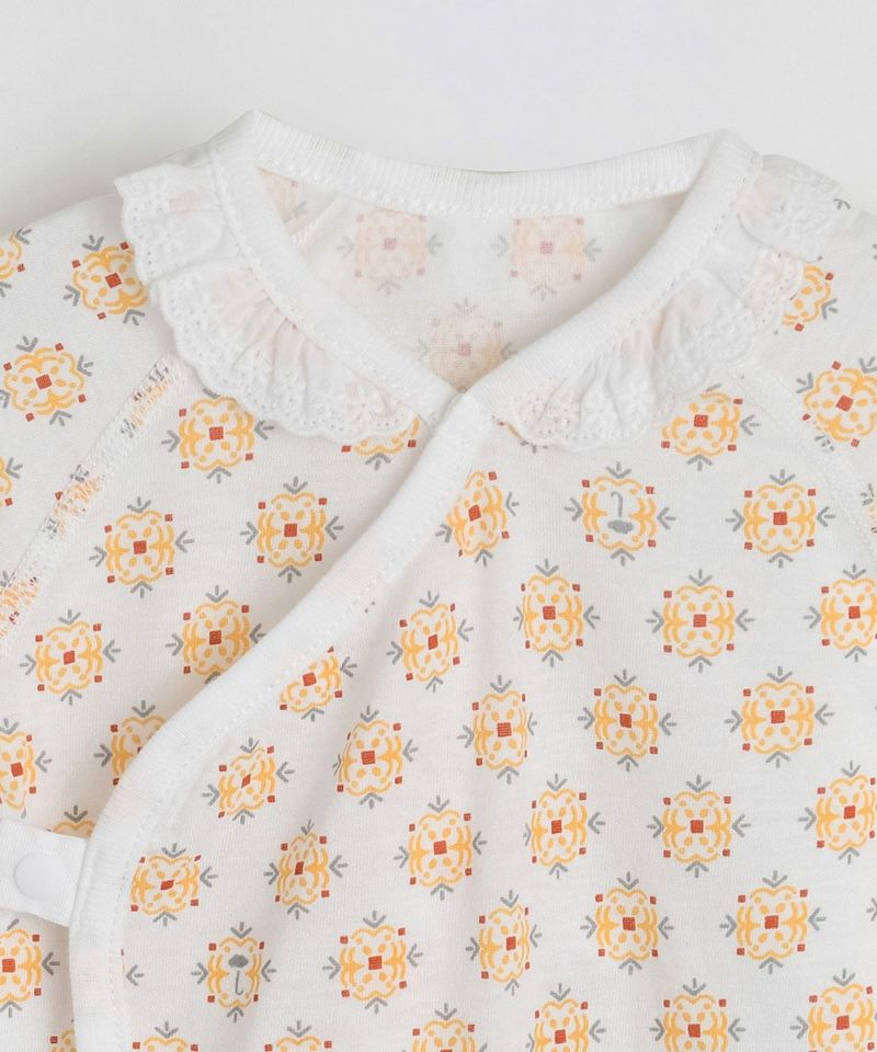抗菌_消臭効果が優れた柔らかいバンブー素材でネック部分のレースがポイントの肌着。アリーおくるみ(W2451JW67P),アリーミトン(W2452FW74P)とのセット使いがおすすめです。