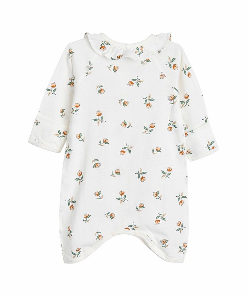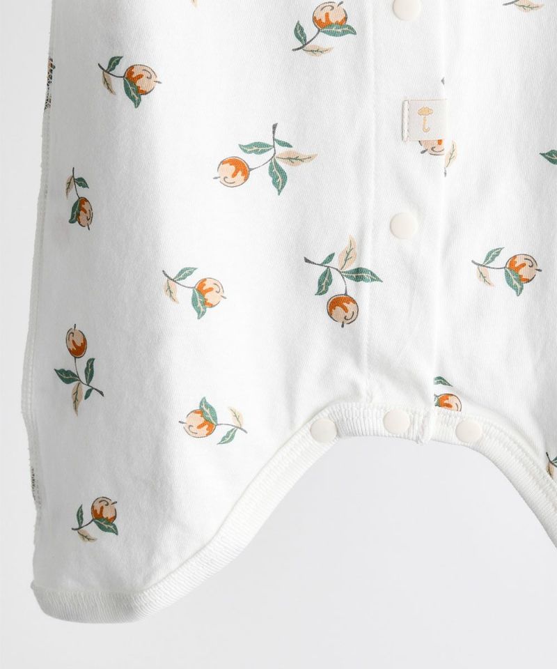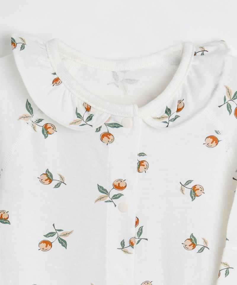 フリル付きの女の子らしい花の実がモチーフの肌着。ベビーギフトにも喜ばれるアイテムです。