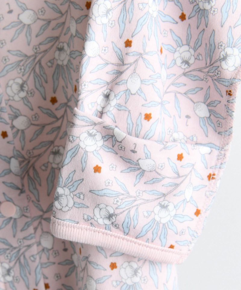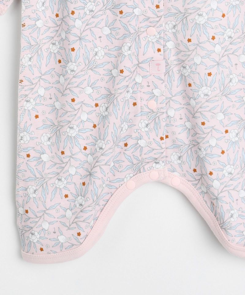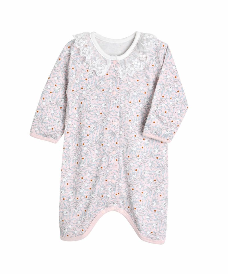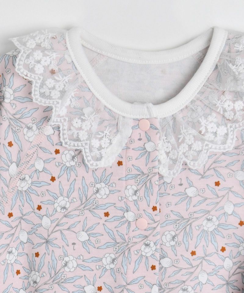 ピンク色のフラワー柄がモチーフの肌着。ネックのフリルがポイントで、女の子らしい雰囲気のアイテム。これから出産を控えている方にもおすすめです。