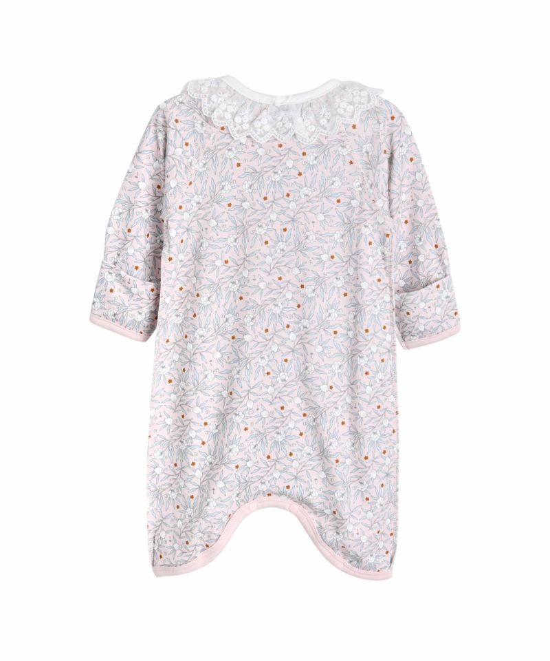ピンク色のフラワー柄がモチーフの肌着。ネックのフリルがポイントで、女の子らしい雰囲気のアイテム。これから出産を控えている方にもおすすめです。