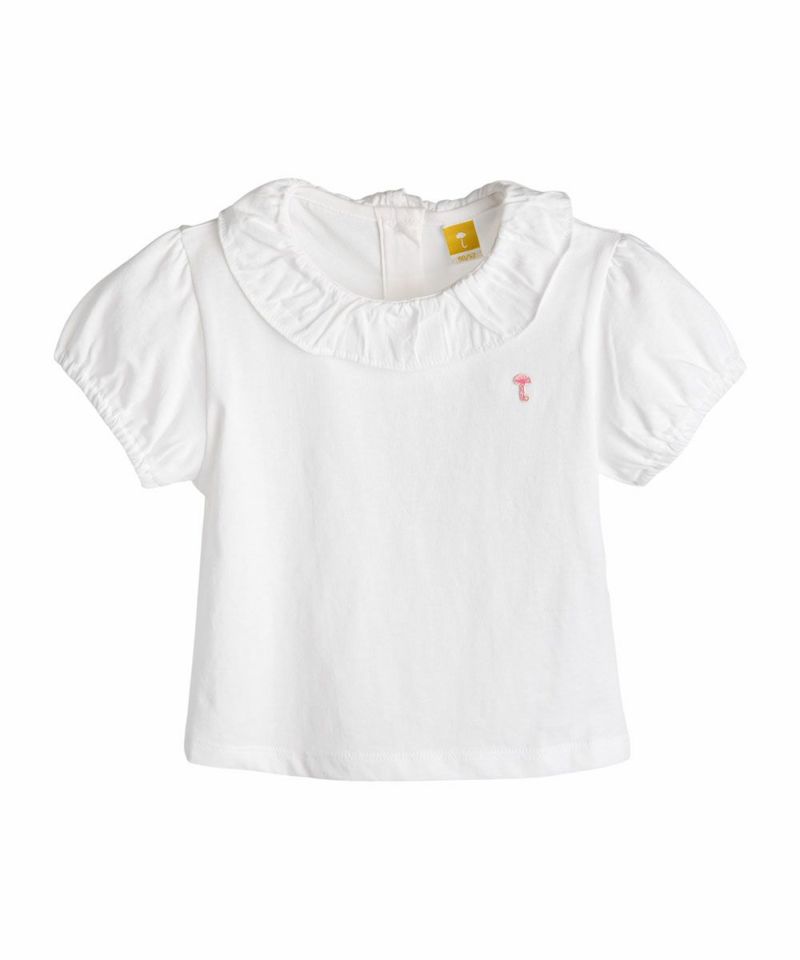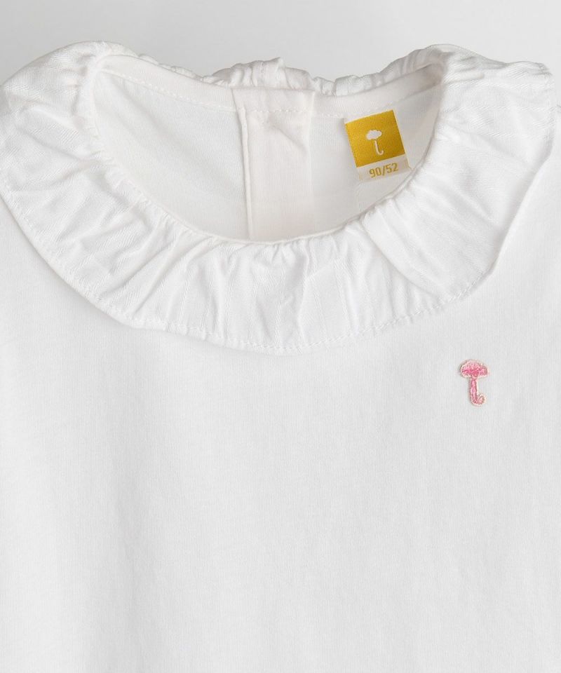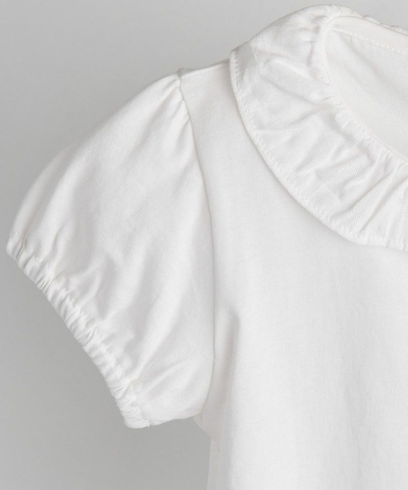 フリル襟が可愛いベーシックフィットの半袖 Tシャツ。一枚だけも着ることができ、夏に紐キャミソールワンピースとコーディネートしてもかわいいアイテムです。