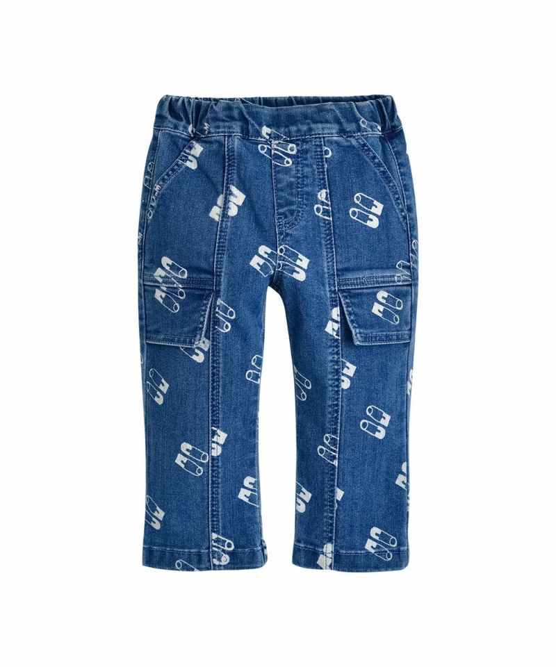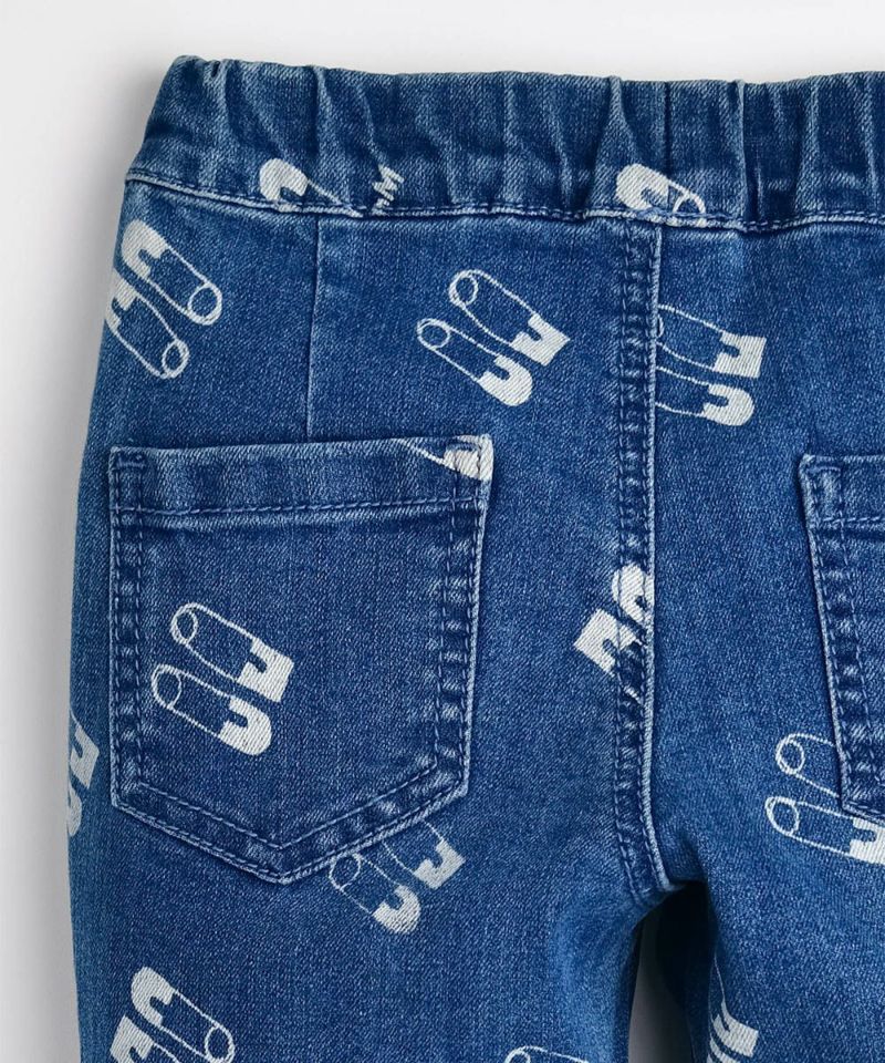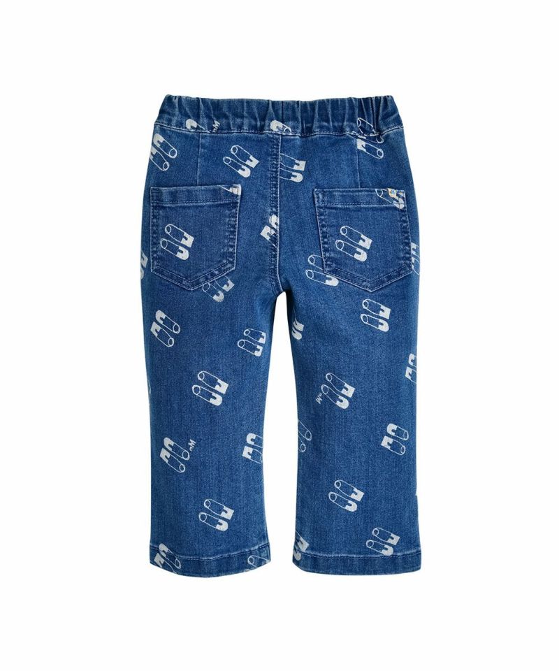 伸縮性のあるデニムに安全ピンの柄がポイントのデニムパンツ。セミワイドフィットで中間のポケットがポイントです。