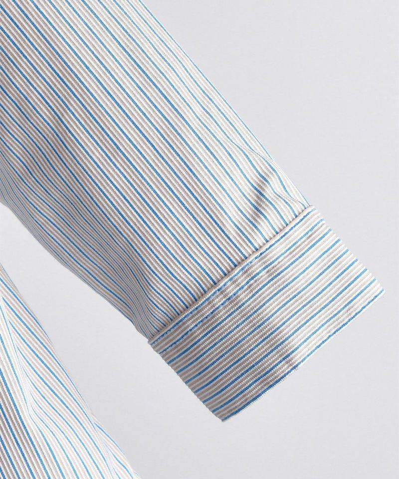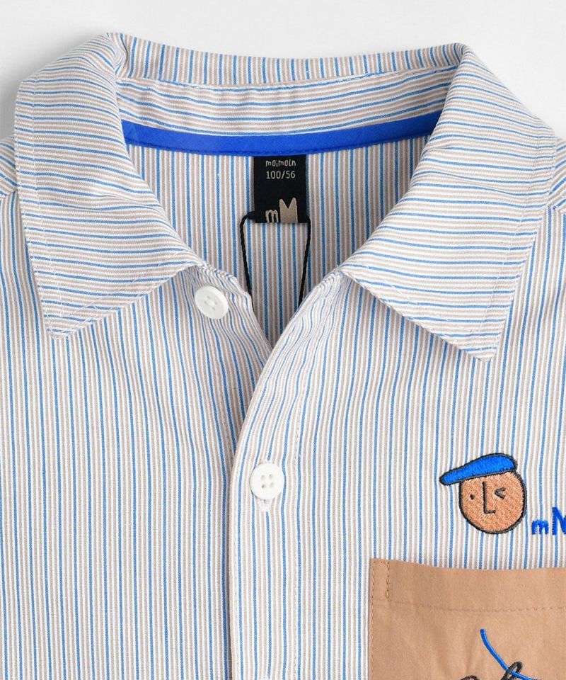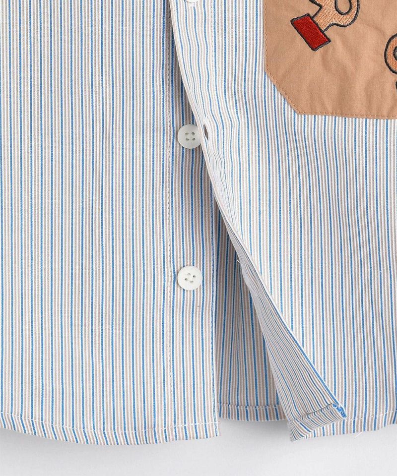 ベージュとブルーの落ち着いた印象のストライプシャツ。ビッグポケットとシーズンテーマに合わせた刺繍がポイント。落ち着いていながらもカジュアルさがあるため様々なシーンで着用いただけます。