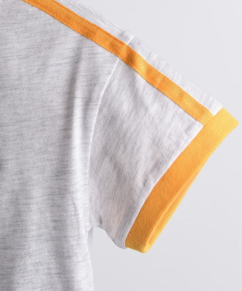 フードメニュープリントが可愛いTシャツ。 ネックと肩のラインがつながっているイエローのバイカラーがポイント♪POPで可愛いコーデが完成します。