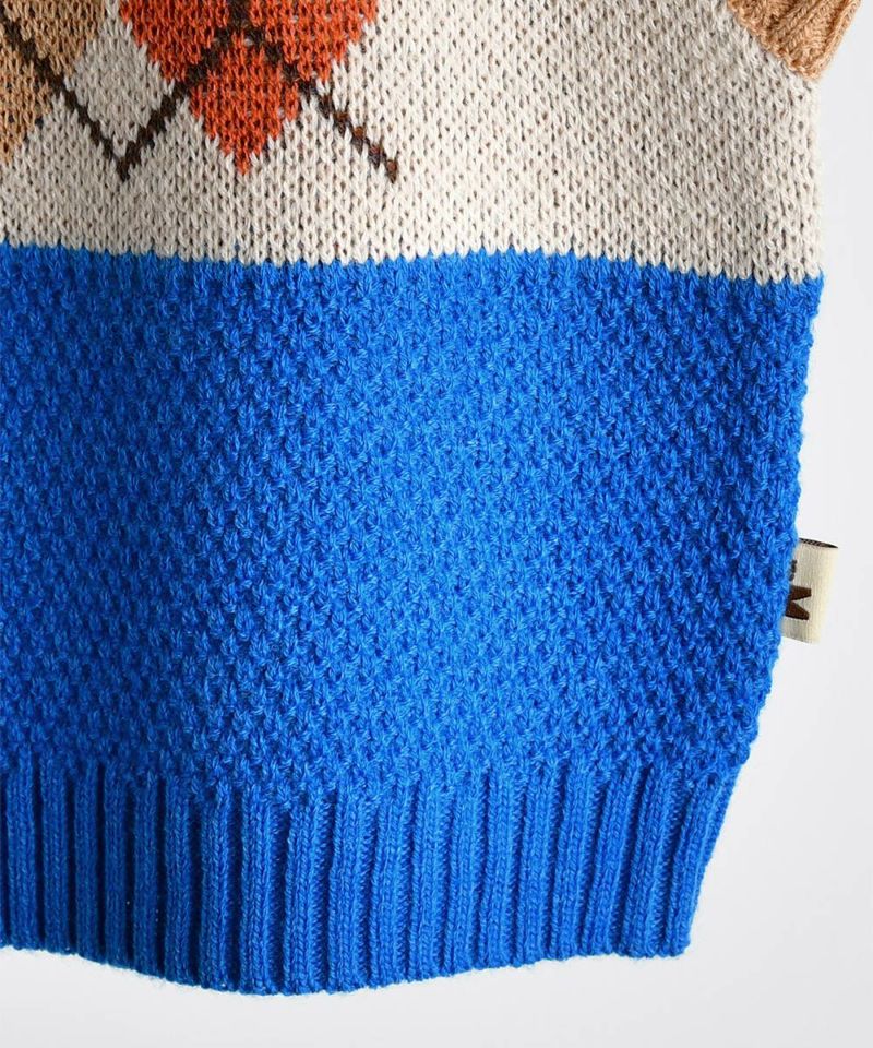 鮮やかな色合いと編み目がユニークなニットベスト。目を惹くアーガイルジャカードポイントで、ルーズフィットで端正なシャツや、ベーシックフィットのTシャツ、いろんなパンツとのマルチコーデができるアイテムです♪