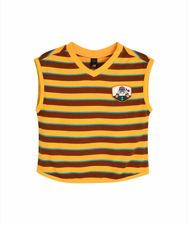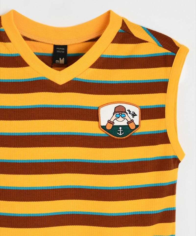 柔らかいレーヨン素材のストライプ柄セットアップ。さわやかなカラー配色ストライプとシーズングラフィックワッペンがポイントのアイテムです。