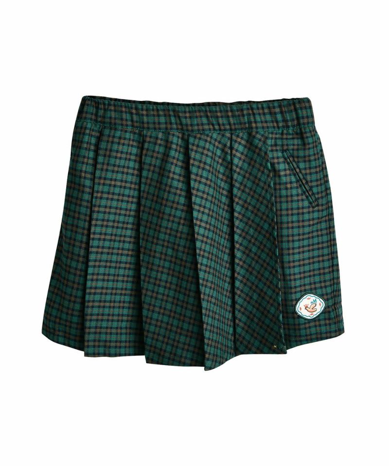 クラシカルなチェックが高級感あふれる4分丈スカートパンツ。鮮やかな青グリーンとかわいいワッペンがアクセントで、プリーツスカートの女の子らしいシルエットと動きやすさが売りのパンツのそれぞれの良い所を採用したデザイン。スウェットトップスやベストなどに合わせるとプレッピースタイルを楽しめるアイテムです。
