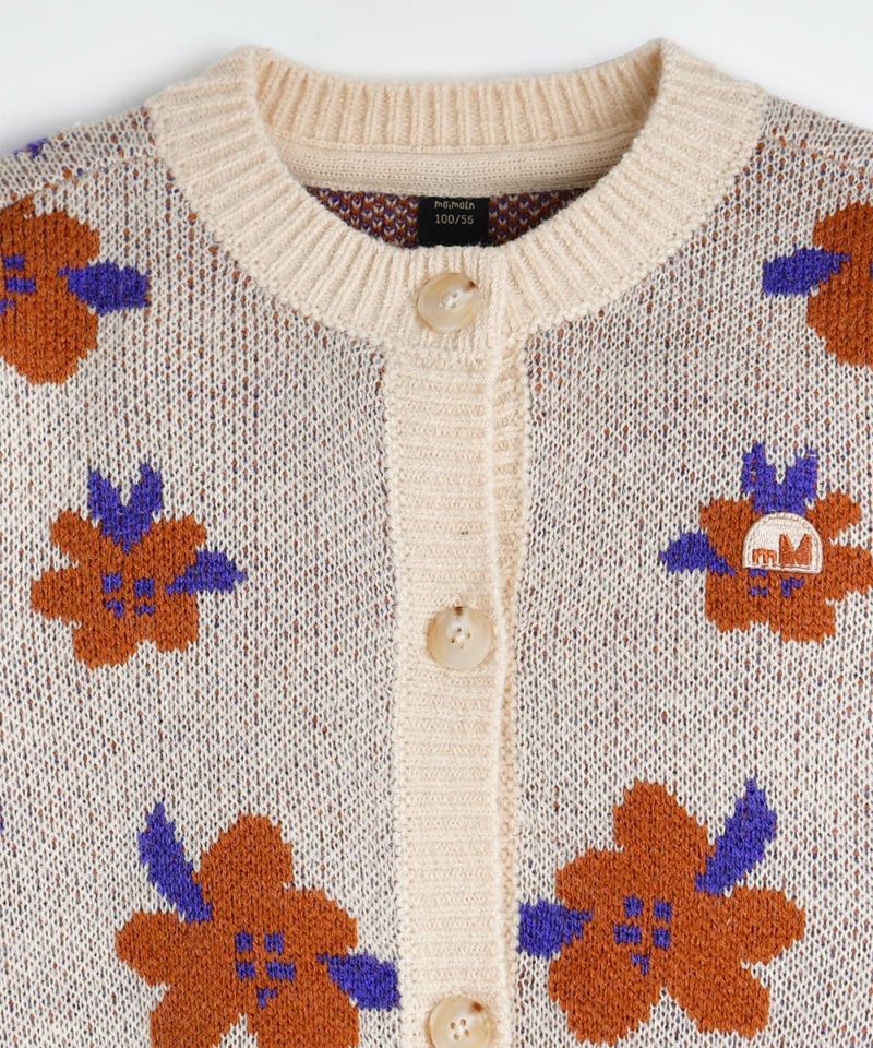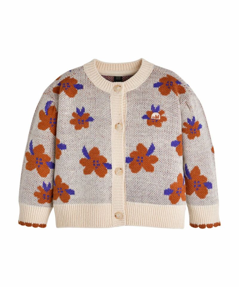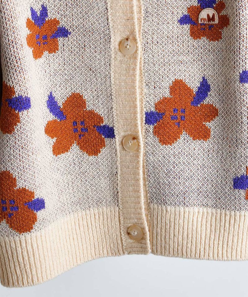 フラワージャカードがムードのあるカラー感のニットカーディガン。ビスチェとベルボトムパンツを一緒にコーディネートしてラブリーなカジュアルルックを演出できるアイテム。花柄ニットビュスチエ(W234VEG31P)とのセットアップ コーデがおすすめです。