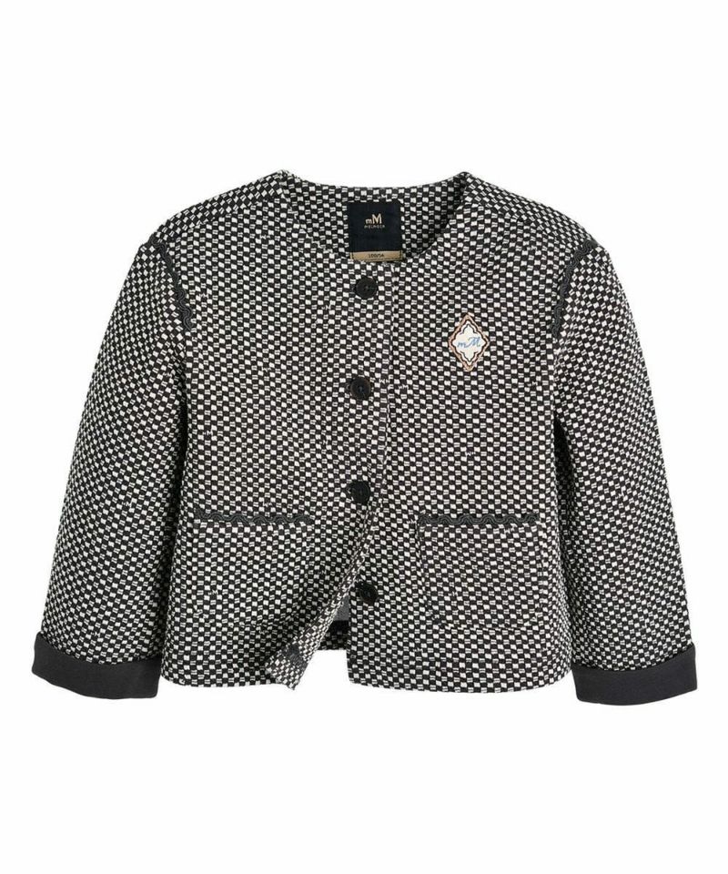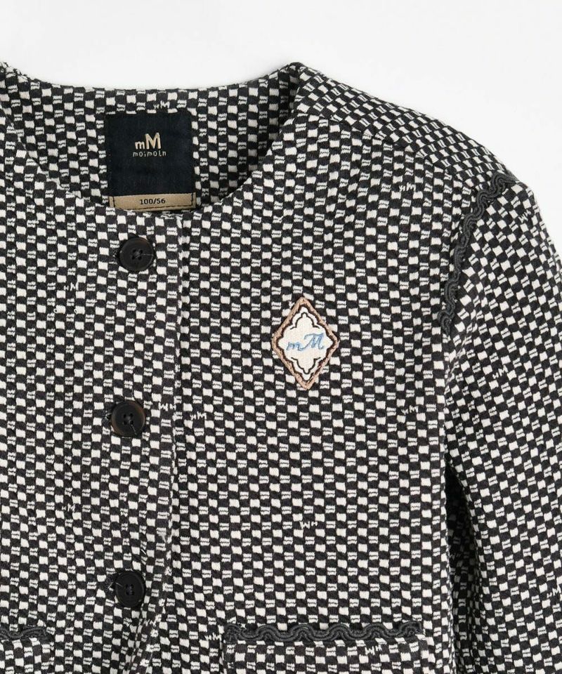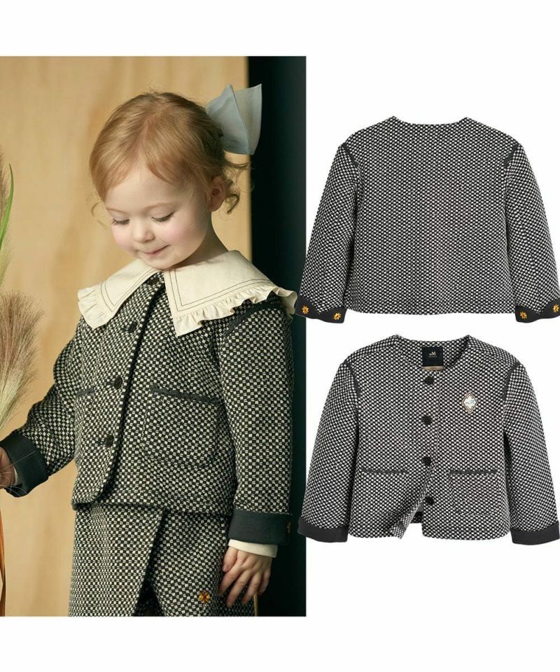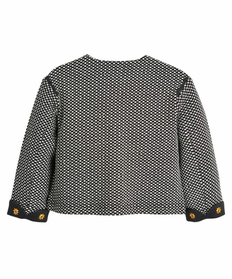 チェックジャカード素材のノーカラージャケット。袖のロールアップのフラワー刺繍がポイントのアイテム。リディアジャカードパンツ(W243KPG25P)とセットアップコーデがおすすめです。