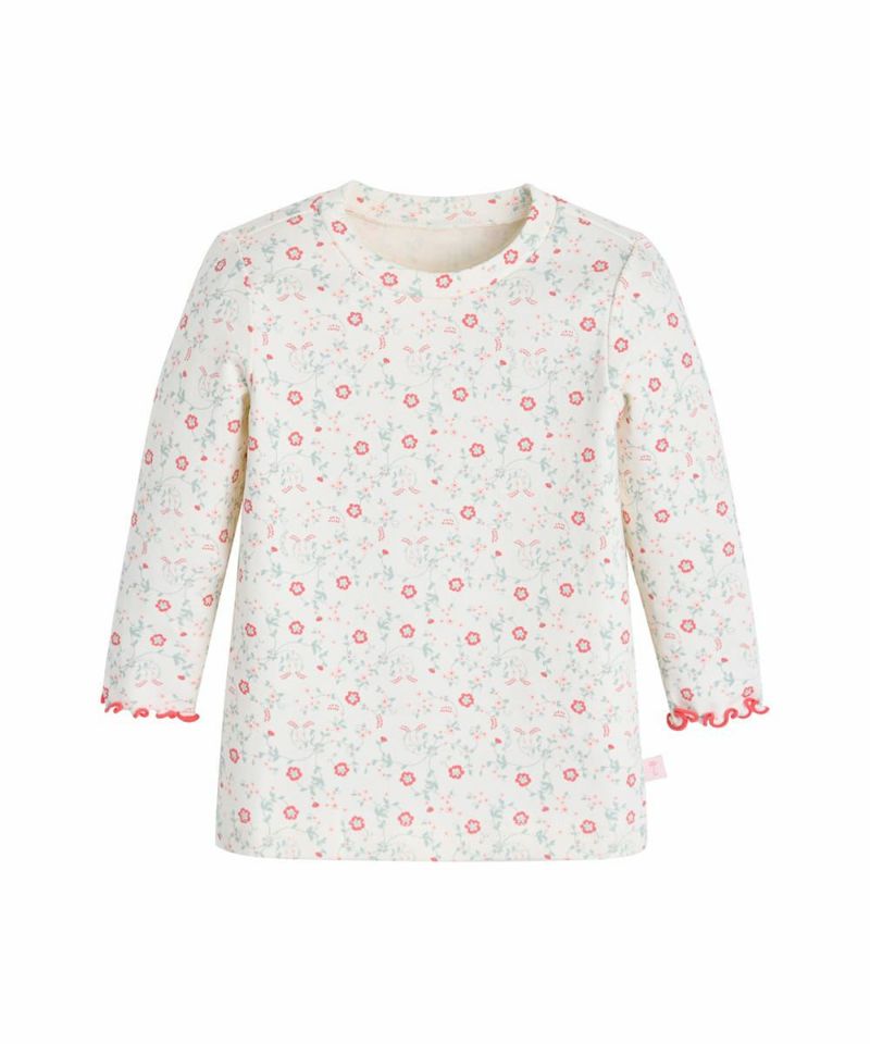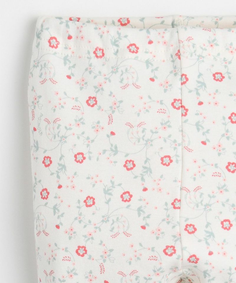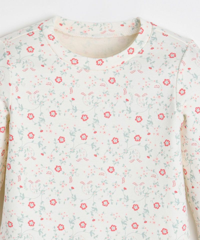 伸縮性の良い素材を使用したルームウェア。女の子らしいかわいい花柄のグラフィックが特徴で、手足元のカラー配色がワンポイントのおしゃれなアイテムです。