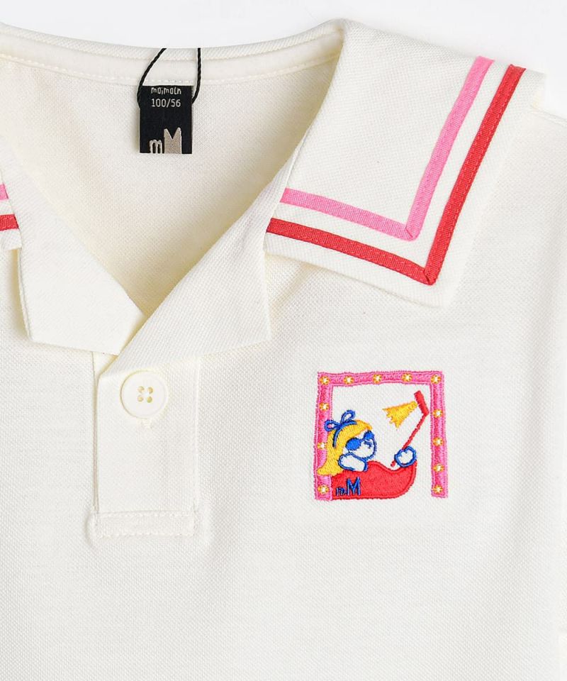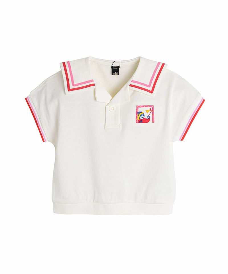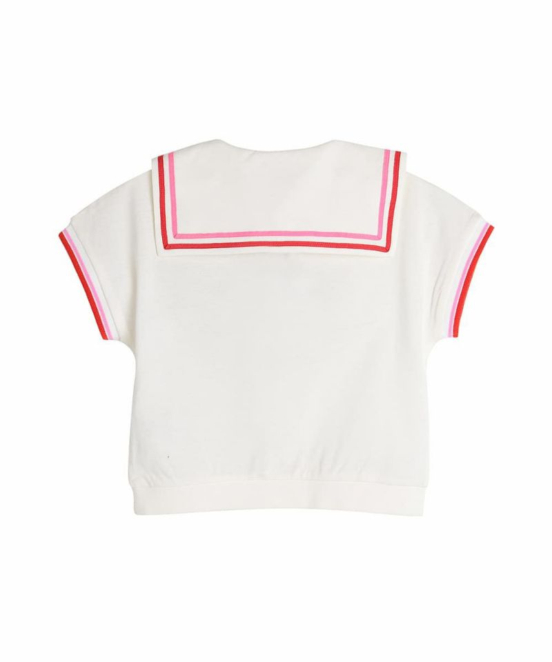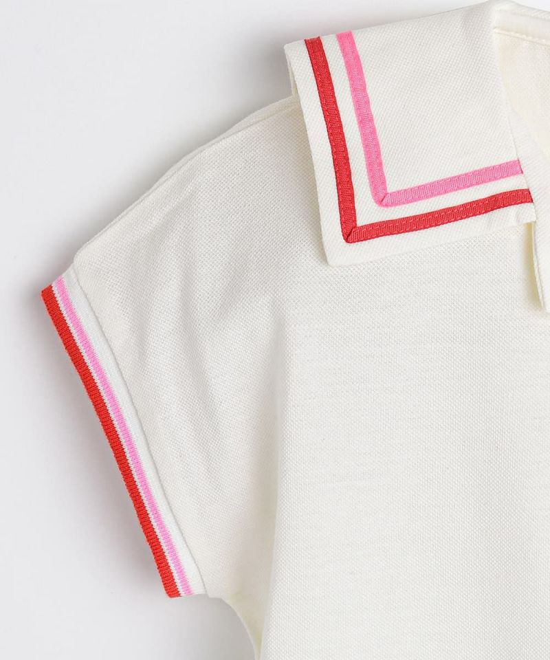 変形のビッグカラーTシャツとプリーツスカートのセットアップ。爽やかな印象で夏のお出かけスタイルにピッタリのアイテムです。