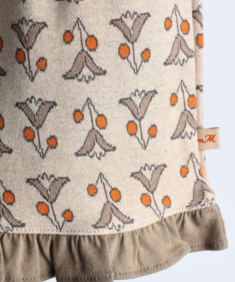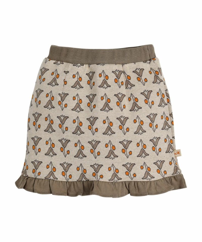 柔らかい素材のTシャツとジャカードスカートのセットアップ。オレンジカラーがポイントで、ベレー帽やロングソックスなどのアイテムで様々なコーデができるアイテムです。