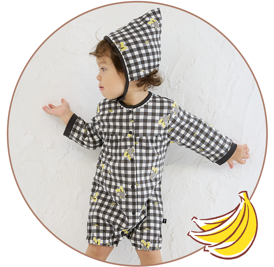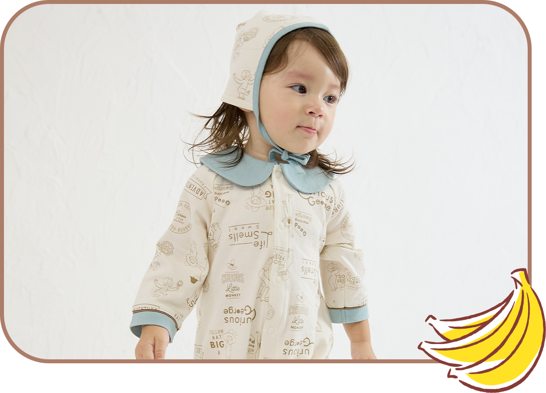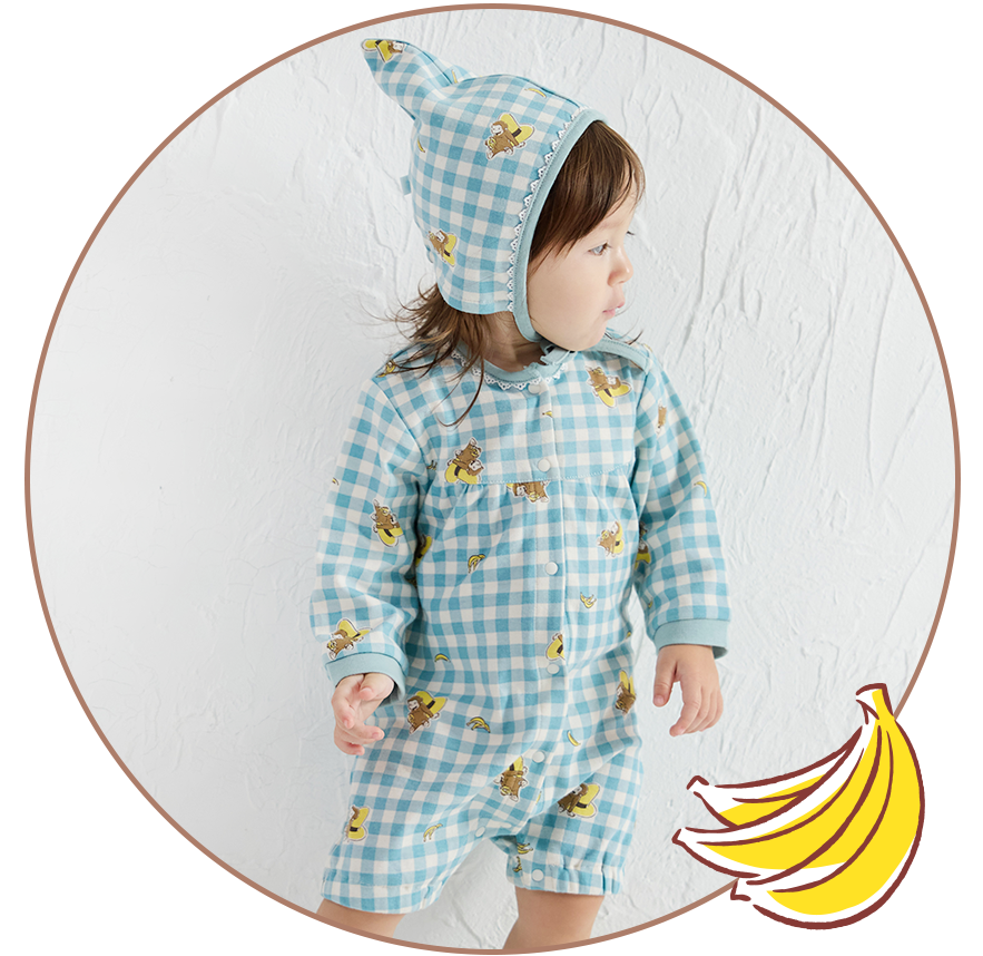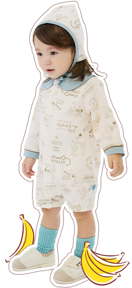 ジョージの大好物のバナナと黄色い帽子のカバーオール。