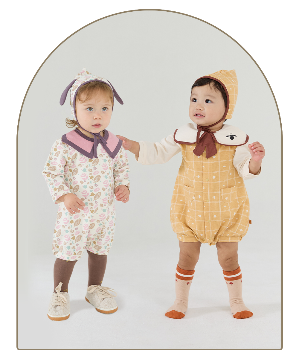 ショーンの耳モチーフ帽子付きカバーオール。