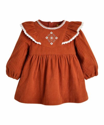 厚みのある生地で秋冬のお出かけにぴったりです。 レンガ色に惹かれて購入しましたが、肩のフリルの広がりや水色の刺繍、レースが想像以上に可愛くてとても気に入っています。