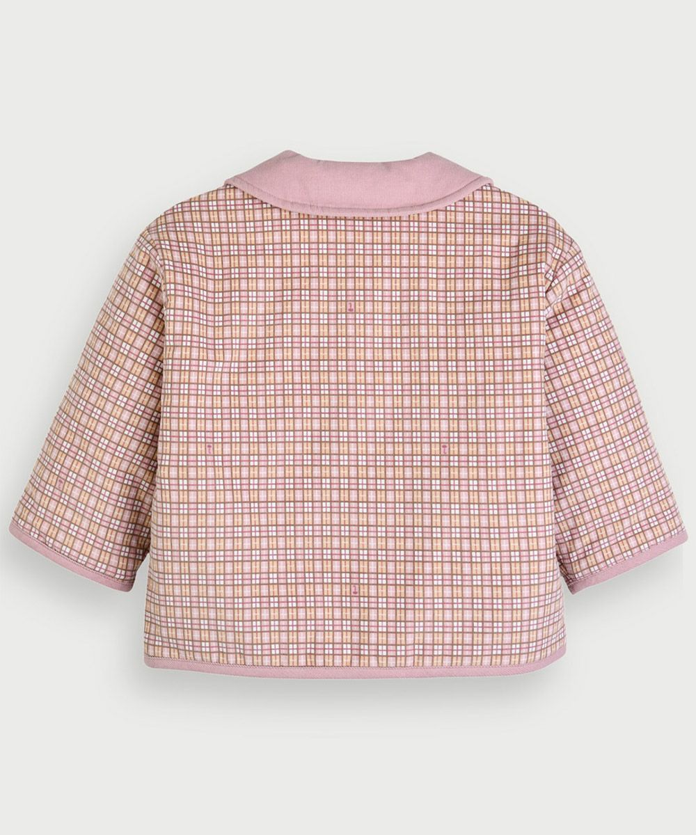 幾何学柄ピンク長袖ニットカーディガン