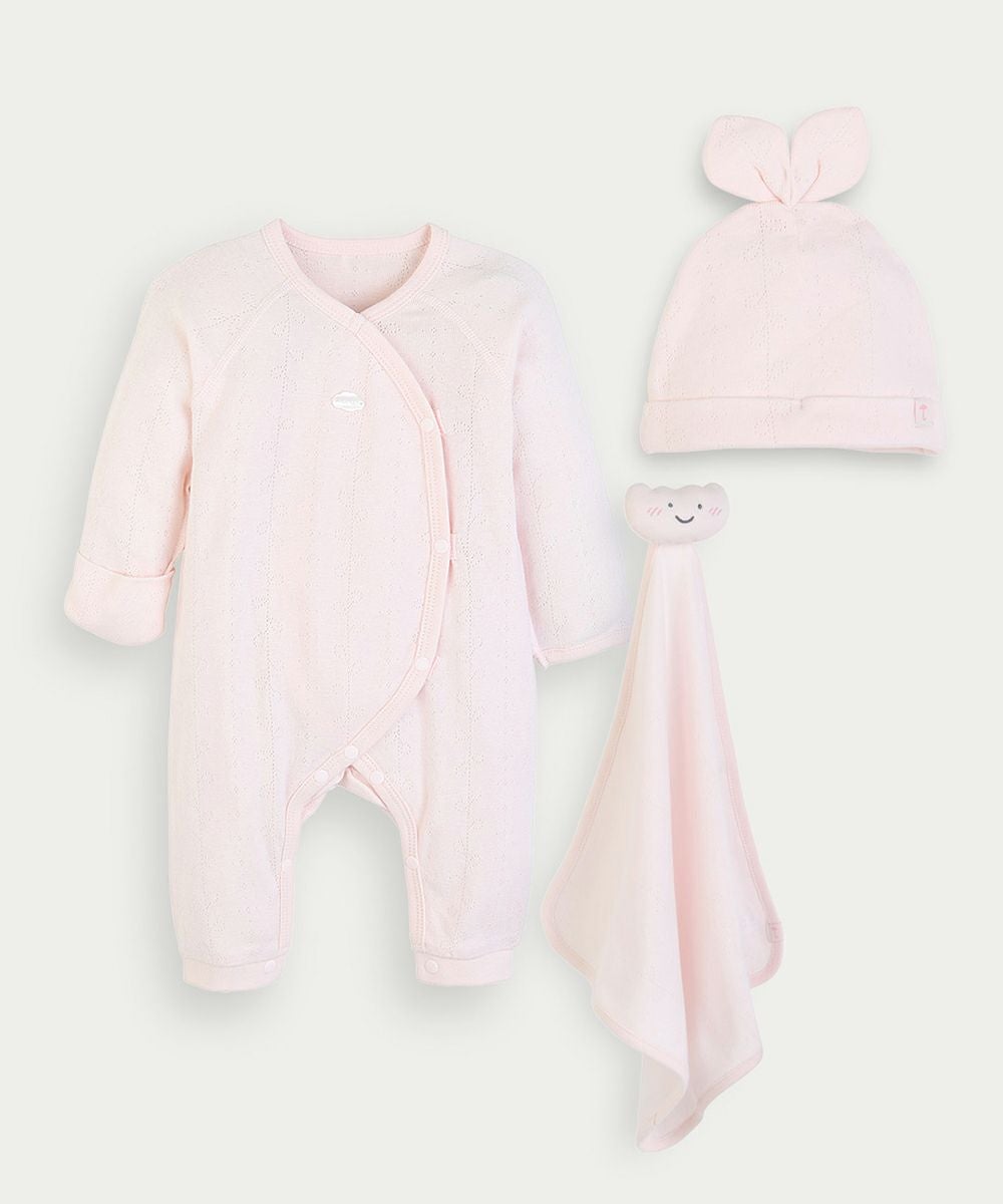 【mini moi】【GIFT/BOX・3点セット】スイートアイレット長袖ロンパース&帽子&ハンカチ