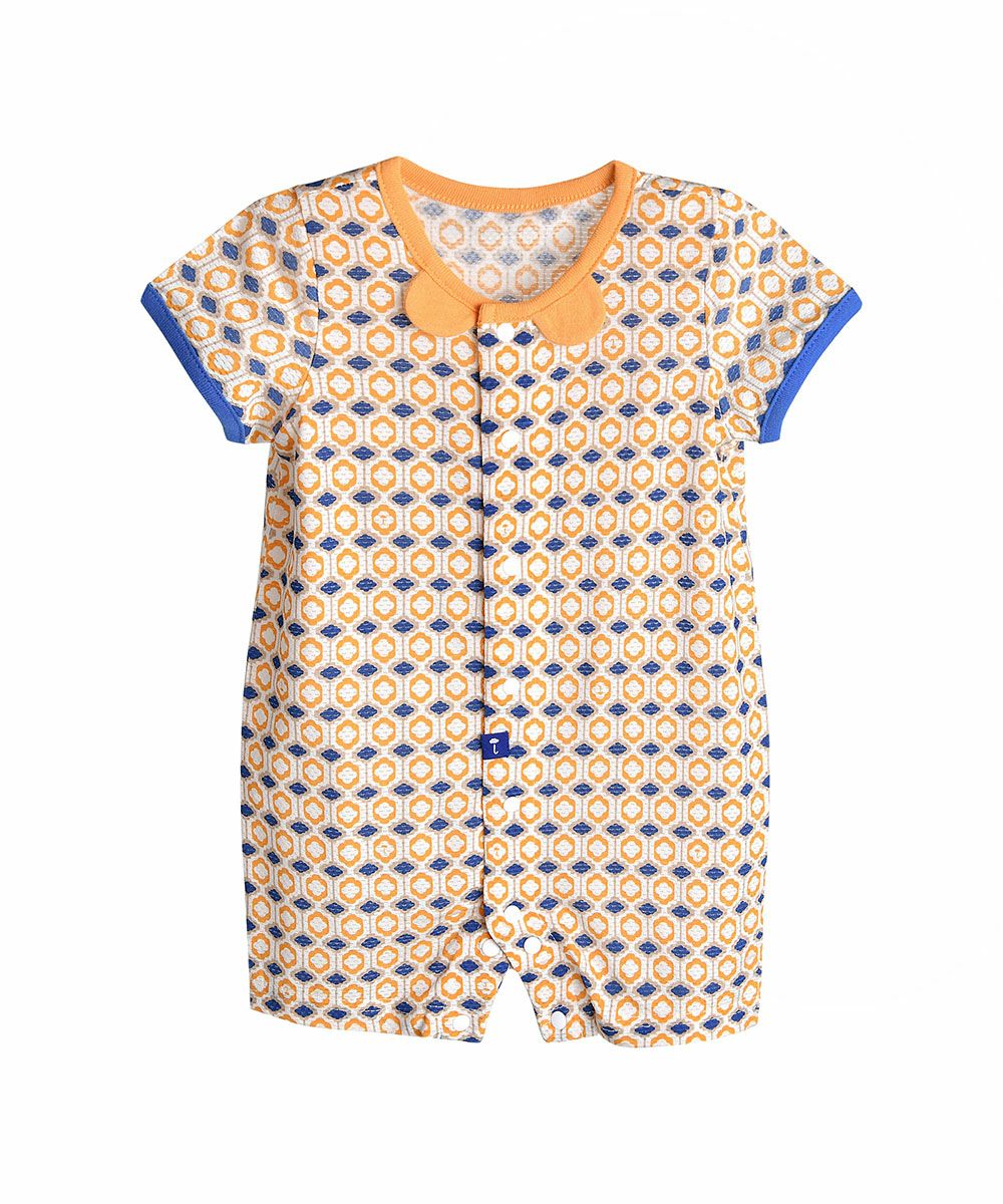 【モダールコットン】ブルーダイヤ柄ロンパース&帽子